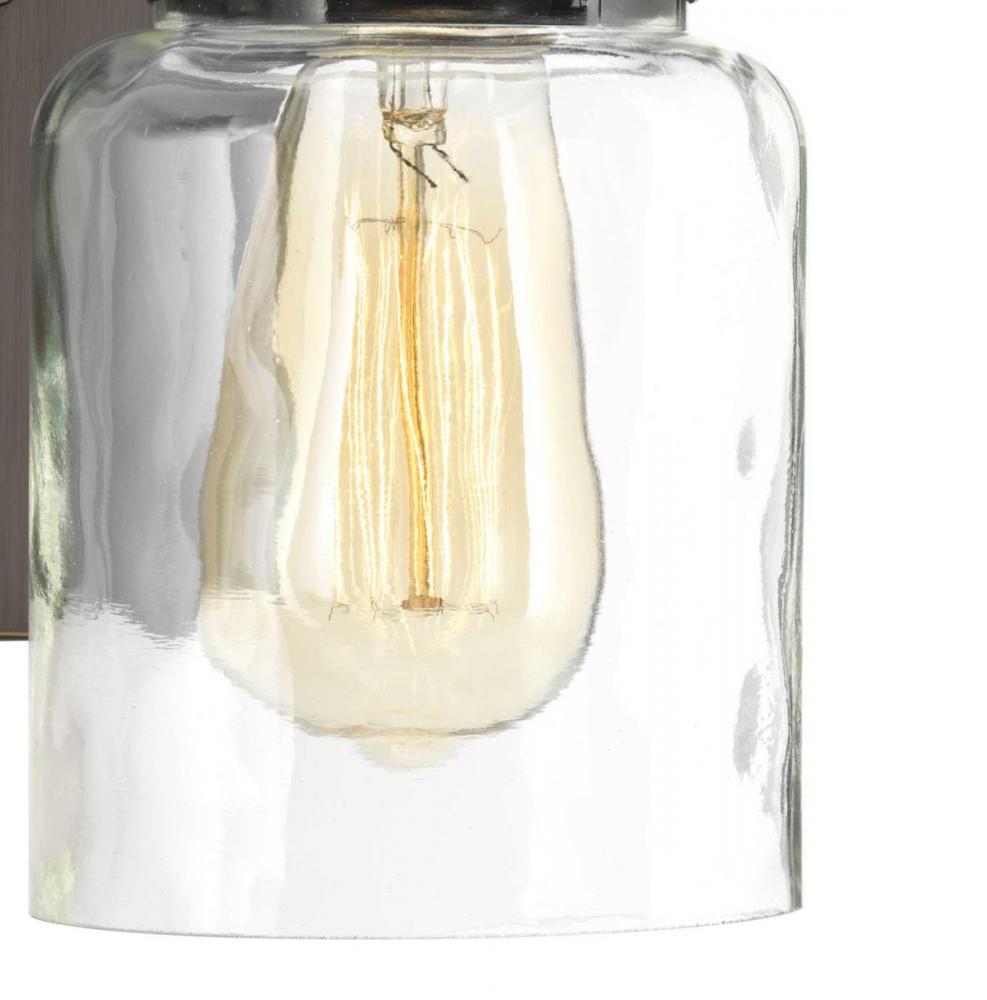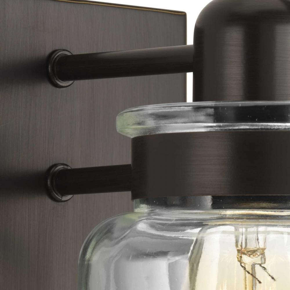 Ideal for a bathroom and powder room.;Perfect for farmhouse and urban industrial style settings;Handsome antique bronze finish;Crisp clear glass shades;Mount the light fixture facing up or down;Use 2 medium base bulbs that are sold separately (100 W max -