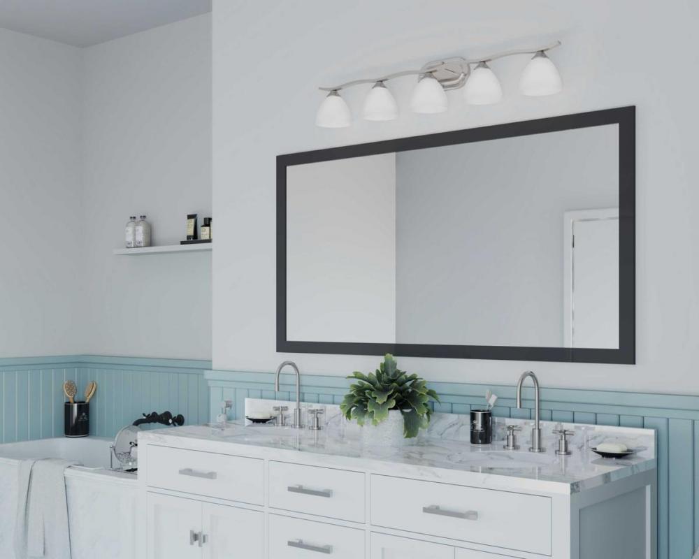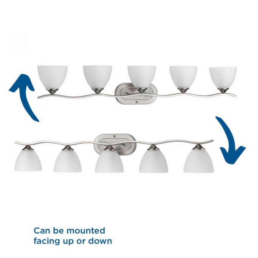 Ideal for a bathroom;Perfect for traditional and transitional style settings;Beautiful brushed nickel finish;Elegant etched glass shades;Mount the light fixture facing up or down;Use 5 medium base bulbs that are sold separately (100 W max - LED/CFL/incande
