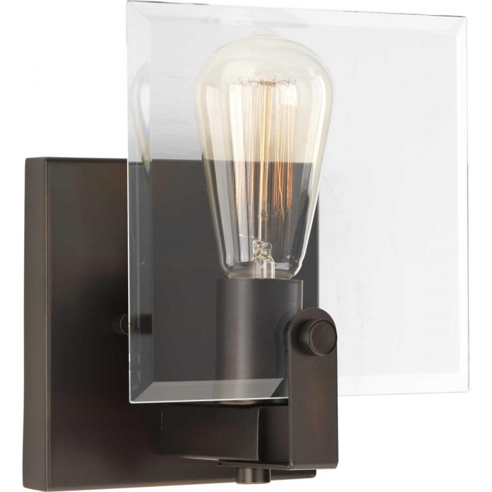 Ideal for a bathroom, dining room, hallway, or foyer;Perfect for luxe, modern, and urban industrial style settings;Handsome antique bronze finish;Crisp clear beveled glass shade;Mount the light fixture facing up or down;Use 1 medium base bulb that is sold