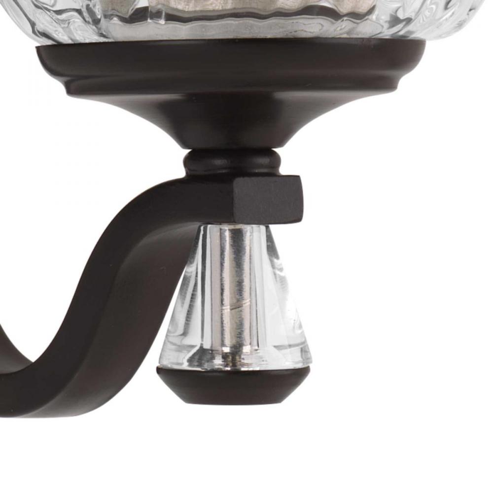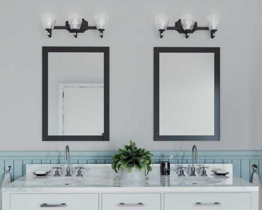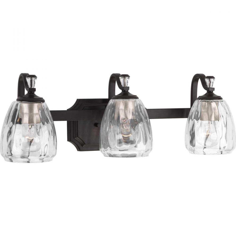 Ideal for a bathroom;Perfect for luxe, new traditional, traditional, and transitional style settings;Handsome antique bronze finish with champagne bronze accents;Elegant clear water glass shades;Mount the light fixture facing up or down;Use 3 medium base b