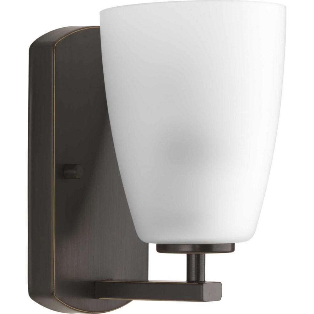 Leap vanity fixtures feature tapered etched glass shades to complement contemporary design trends. One-light bath & vanity in an Antique Bronze finish.