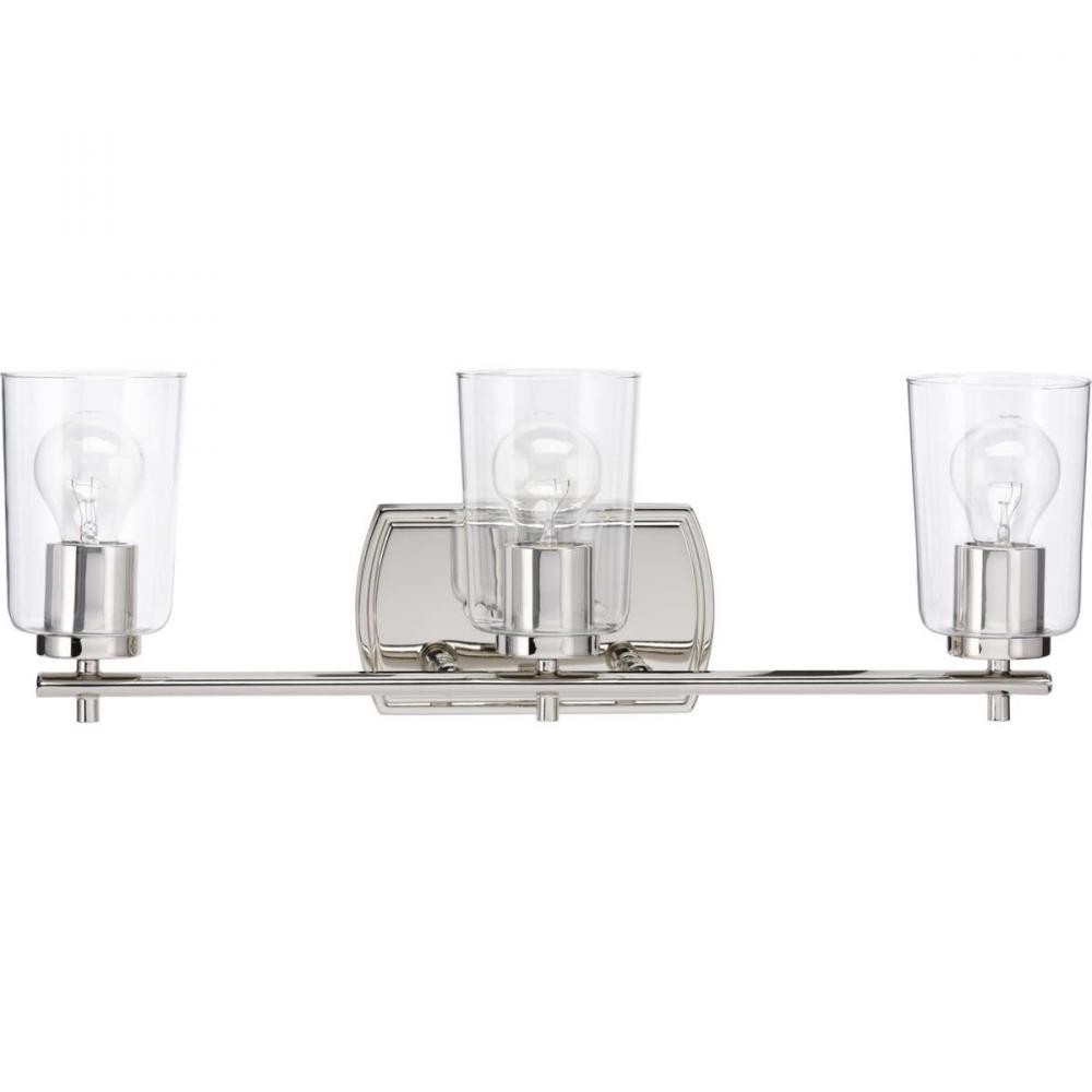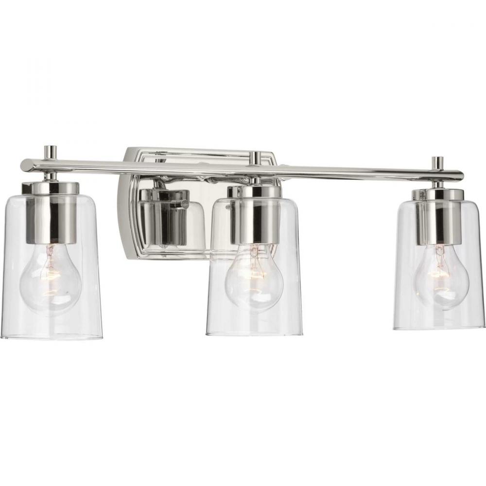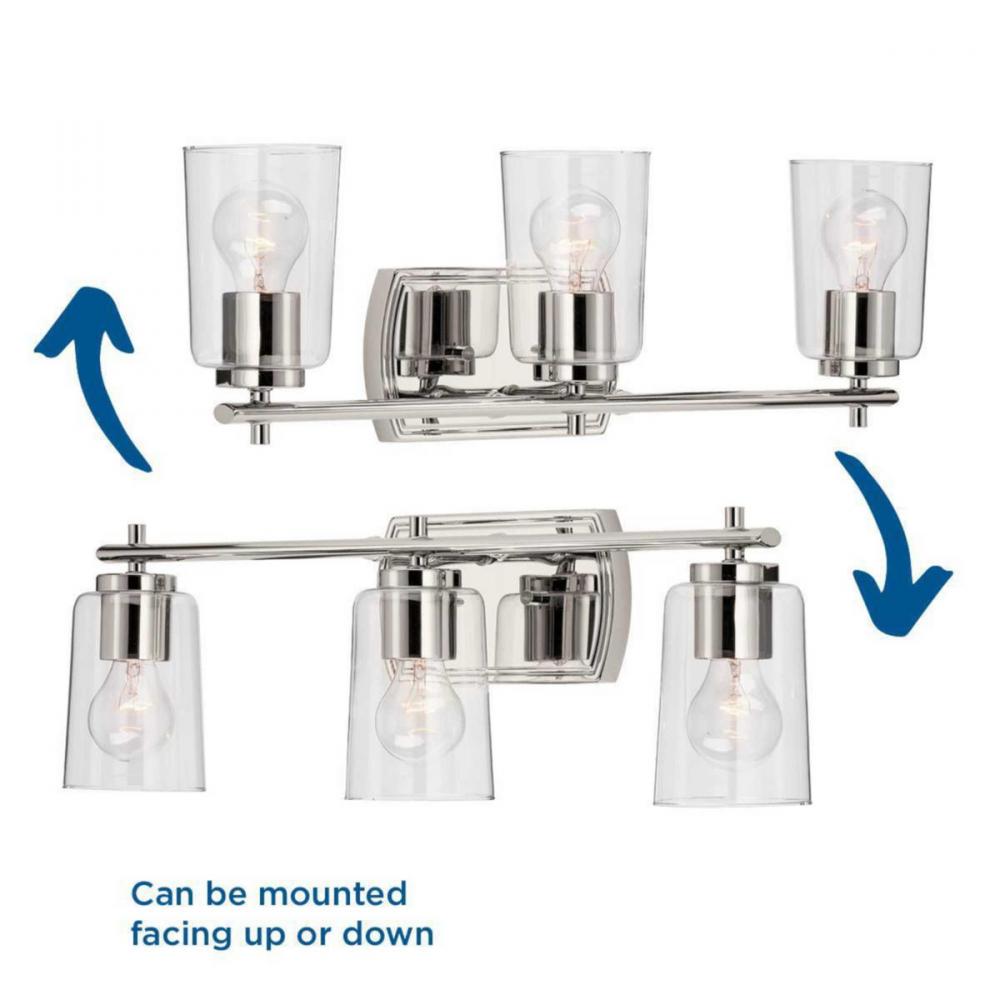 Ideal for a bathroom;Perfect for new traditional, traditional, and transitional style settings;Subtle polished nickel finish;Crisp clear glass shades;Mount the light fixture facing up or down;Use 3 medium base bulbs that are sold separately (60 W max - LED