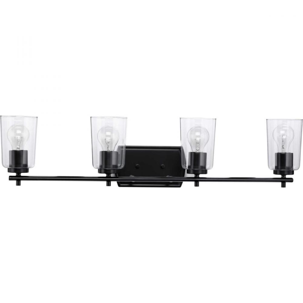 Ideal for a bathroom;Perfect for new traditional, traditional, and transitional style settings;Classic matte black finish;Crisp clear glass shades;Mount the light fixture facing up or down;Use 4 medium base bulbs that are sold separately (60 W max - LED/CF