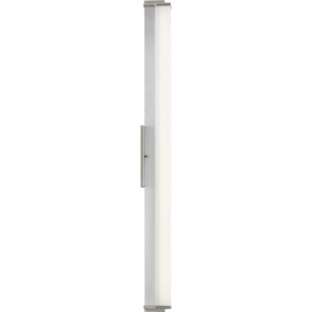 Ideal for a bathroom;Perfect for modern style settings;Beautiful brushed nickel finish;Crisp white acrylic shade;Fixture can mount horizontal and vertical;Includes 1 integrated LED (34 W), 2450 lumens, 3000 K, 90 CRI, dimmable;Measures 36-inch width by 4.