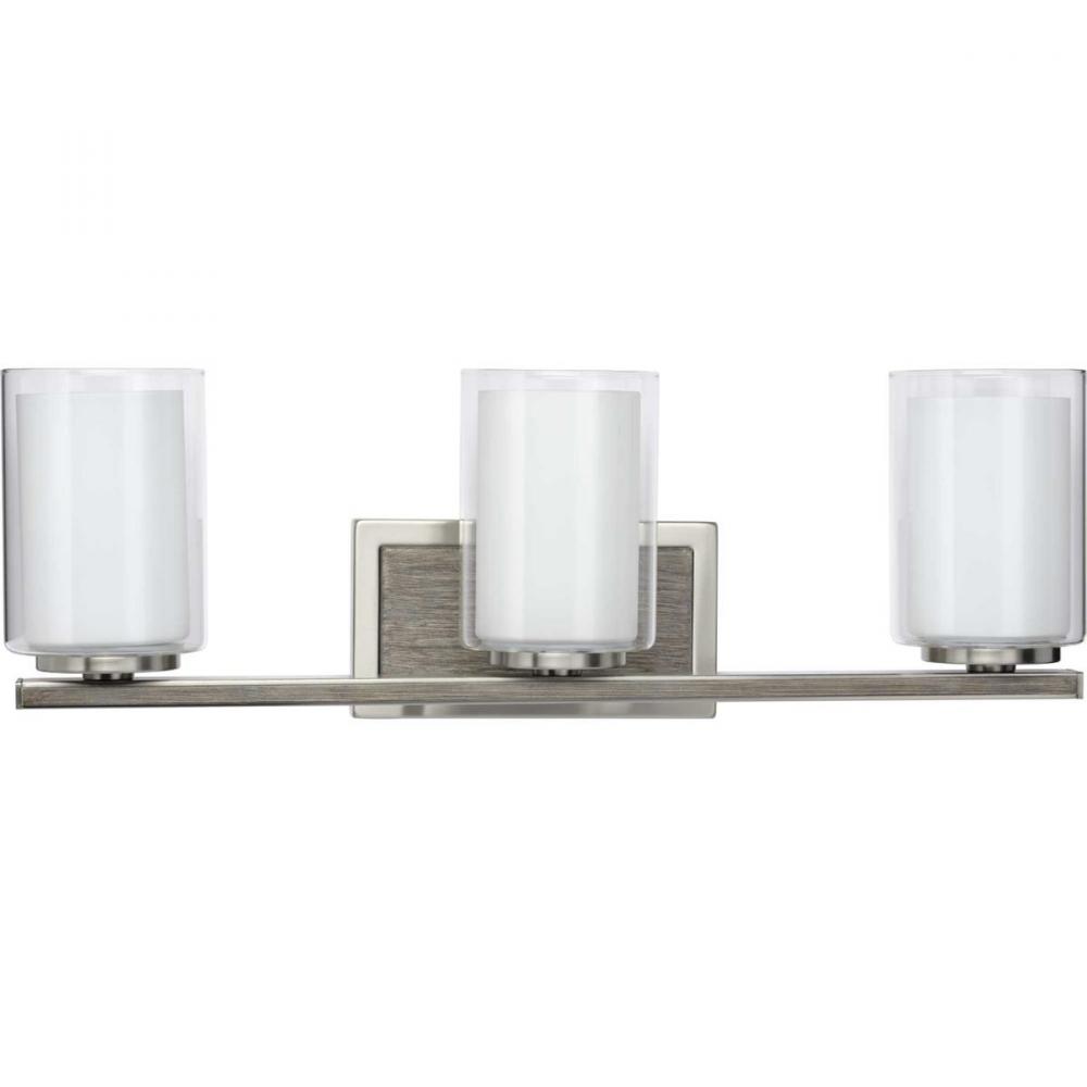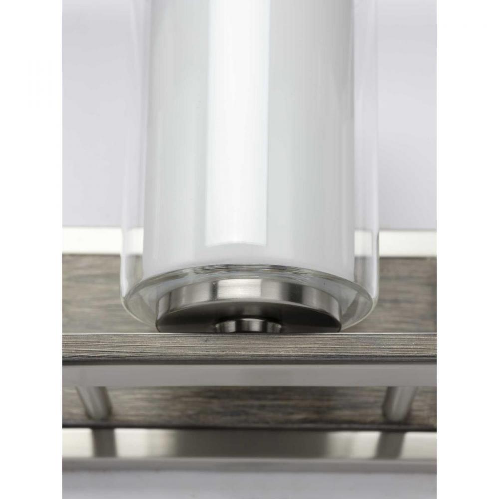 Experience an oasis of tranquility with the Mast three-light bath. A combination of faux wood accents and a Brushed Nickel finish allows the clean backplate and supporting bar the subtly contrast the classic pairings of clear and etched glass light shades. This beautiful piece will bring a breath of fresh air to bath and vanity settings in coastal and modern farmhouse interiors.
