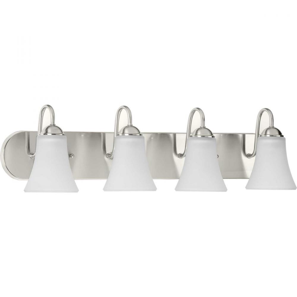 Dismiss shadows with an alluring design of the Classic four-light bath. Charming, bell-shaped, etched glass shades and clean, curved arms add subtle character showcased against a curved, Brush Nickel backplate. The classy fixture makes a divine addition to bathroom mirrors and dining room or other living areas in transitional interiors.