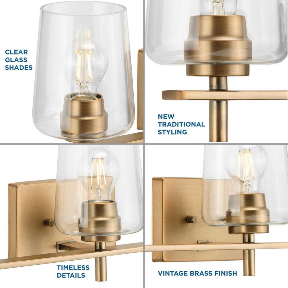 Create an enduring silhouette ornamented by timeless details with a bath vanity light from the Calais Collection. The elegantly simple frame is coated in a golden vintage brass finish. Clear glass shades provide a contemporary take on the traditional design. Compatible with dimmable bulbs.