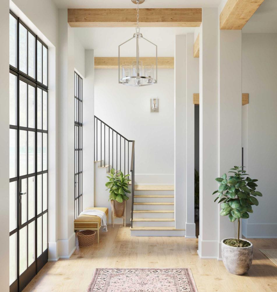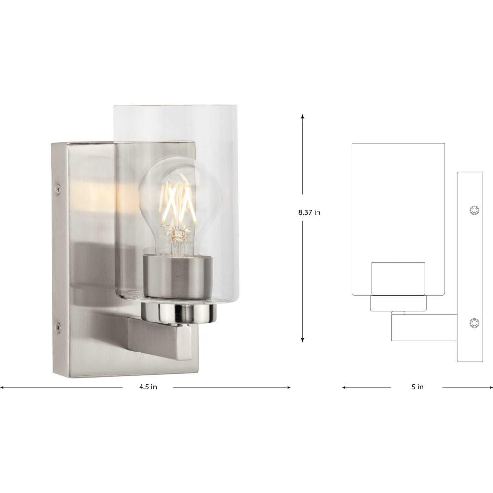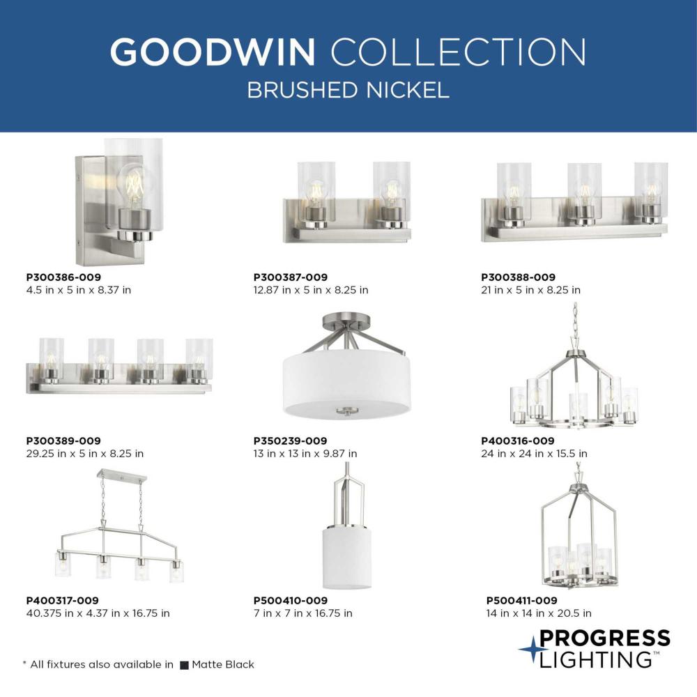 Update any bathroom with the Goodwin Vanity Light, whose clean design seamlessly blends with todays modern decor. Finished in subtle brushed nickel, its crisp lines highlight the modern profile of the rectangular backplate that supports a column with a clear glass shade for bright illumination in the bath. This versatile fixture can be mounted with glass facing up or down, casting even illumination in any setting.