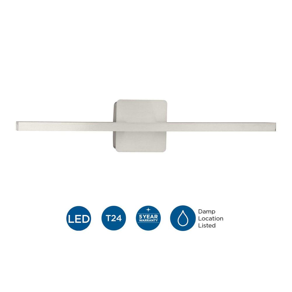 Elevate your space with the 24-inch Phase 5 Linear Vanity Light, a sophisticated lighting solution that seamlessly blends form and function. Crafted precisely from high-quality aluminum coated in subtle brushed nickel, this fixture is designed to impress. The integrated acrylic lens adds a refined touch, diffusing light softly and evenly for a truly inviting ambiance. Customize your lighting experience with the selectable CCT (Correlated Color Temperature) feature, offering a range of 3000K for warm and cozy lighting, 4000K for a neutral and vibrant atmosphere, or 5000K for crisp, daylight-inspired illumination. With a high Color Rendering Index (CRI) of 90, the fixture ensures that colors remain accurate and vibrant under its light. This wall-mounted linear vanity light is ideal for gracing your bathroom or dressing area with functional, stylish lighting. It is CA/T24 JA8 compliant, meeting the stringent energy efficiency and performance standards.