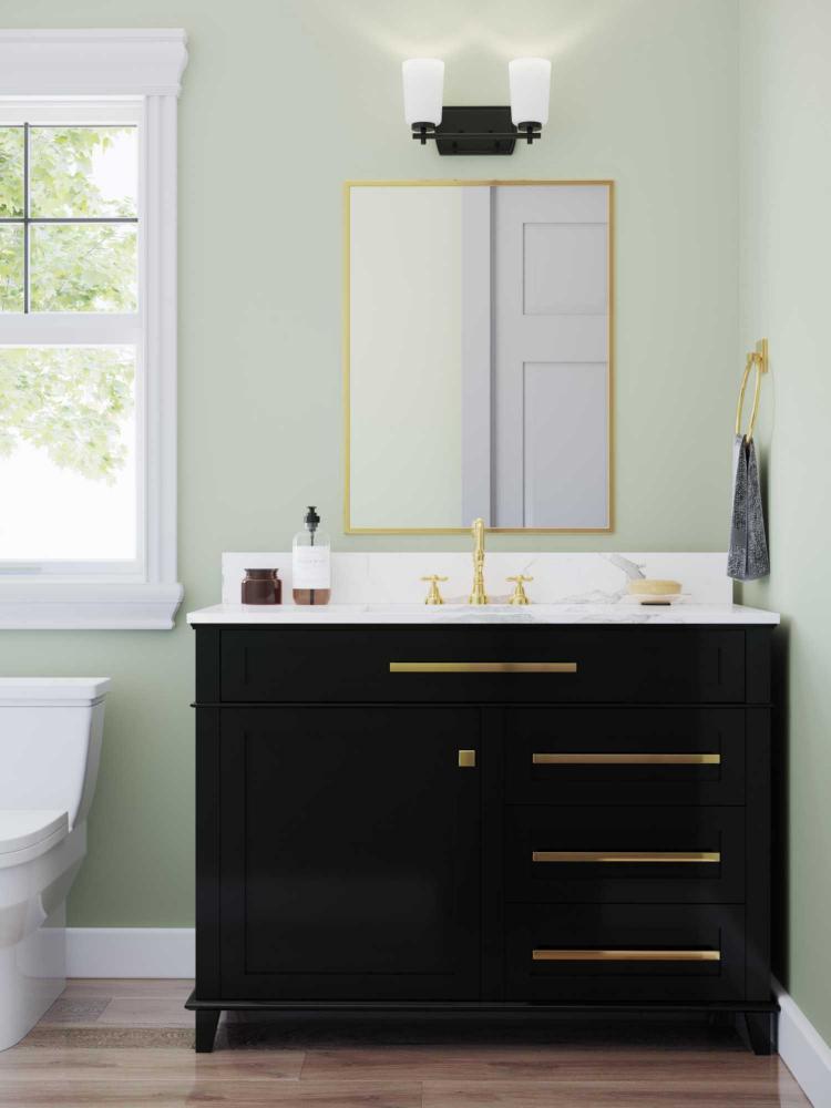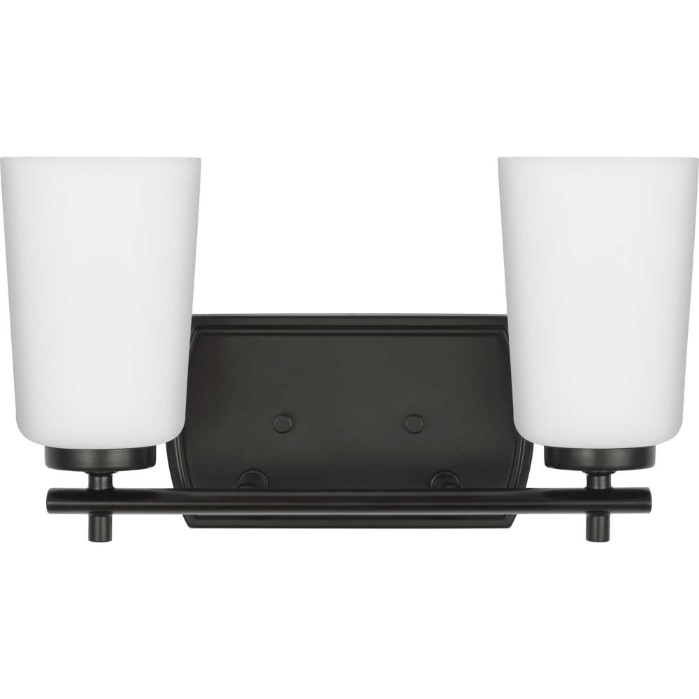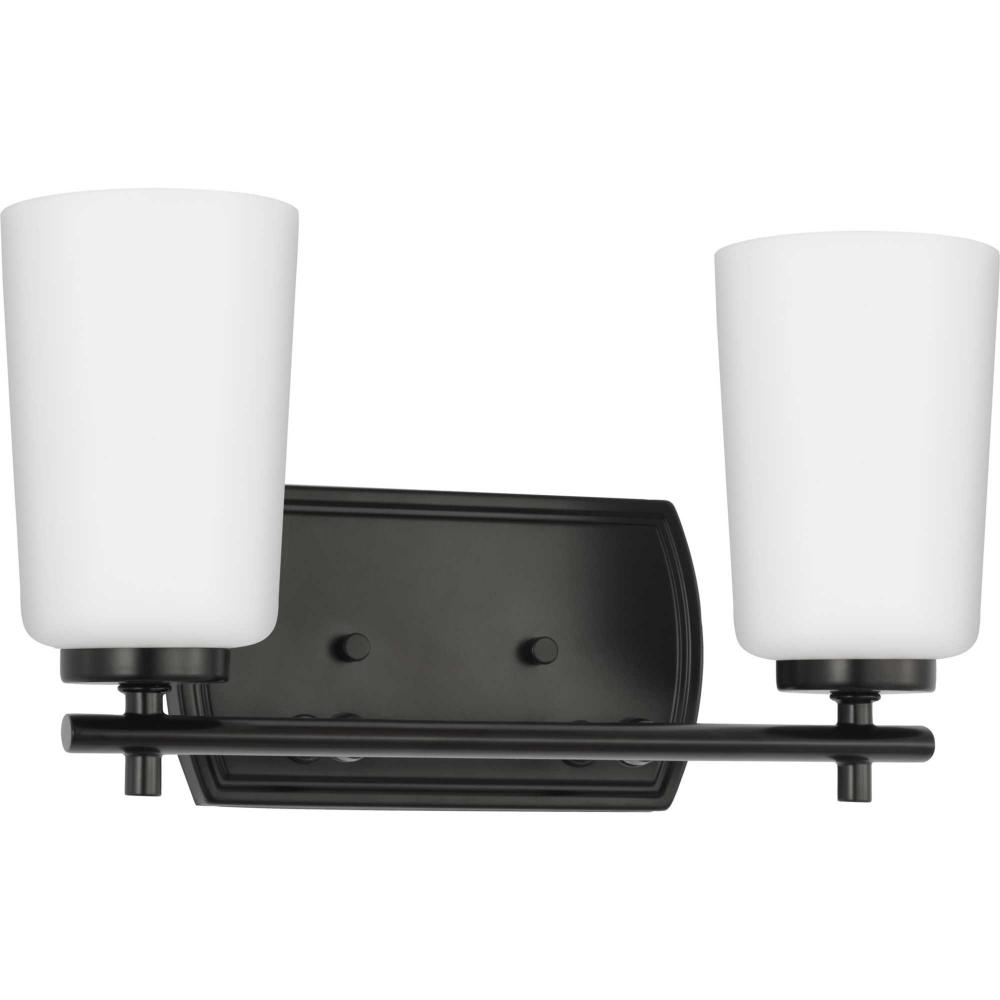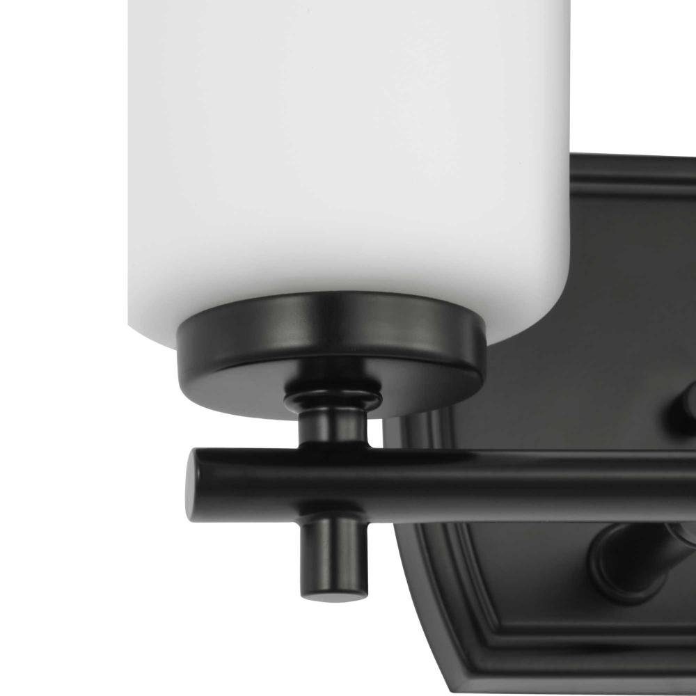 Fundamentally modern but with a traditional twist, the Adley vanity light combines opal glass shades with a curved edge backplate and a simple, straight bar finished in crisp matte black. This light is an elegant choice for illuminating new traditional and transitional settings.