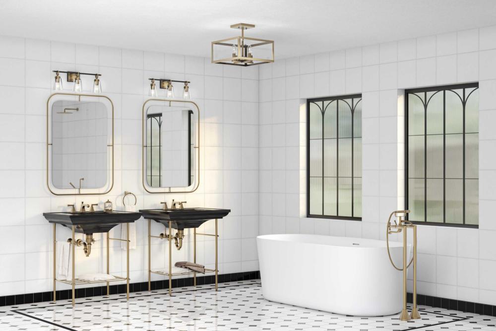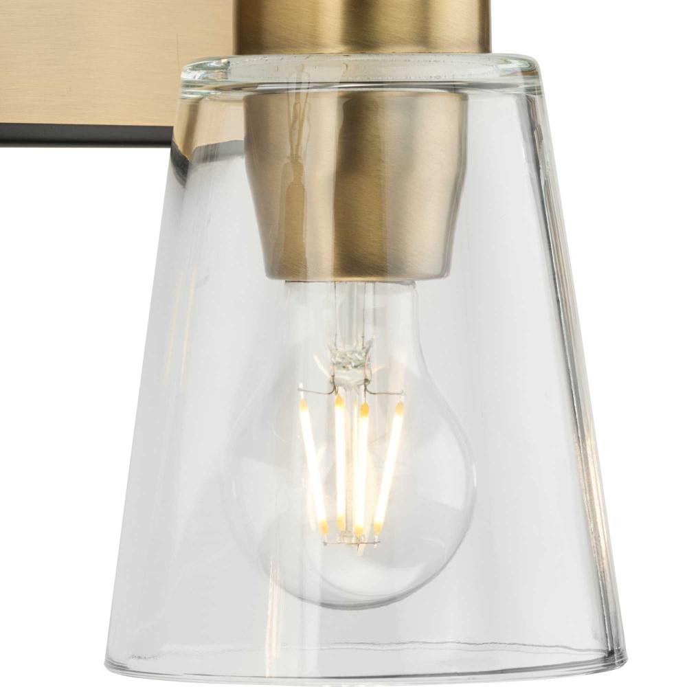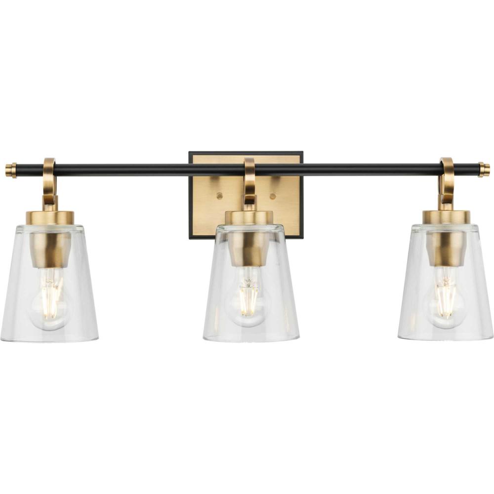 The Cassell Three-Light Vanity Fixture brings an enduring style to the bath. The light boasts a dual-tone finish of Vintage Brass and Matte Black that accentuates its distinguished and handsome design. Tailored details smoothly blend linear precision with elegant circular rings and clear glass shades.