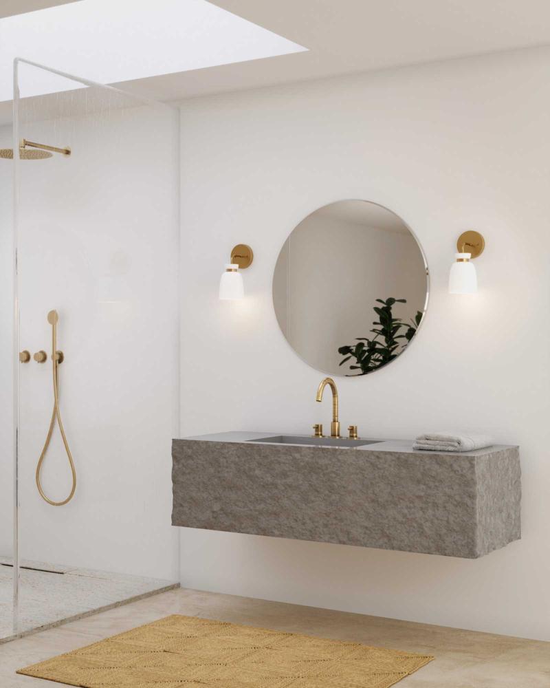 The Lexie One-Light Vanity Light is full of spunk with a fresh new style for todays home. A slender minimalist frame finished in Brushed Gold supports opal glass shades with a distinctive cinched metallic collar.The versatile fixture can be mounted facing up or down, offering the perfect amount of illumination to the room.