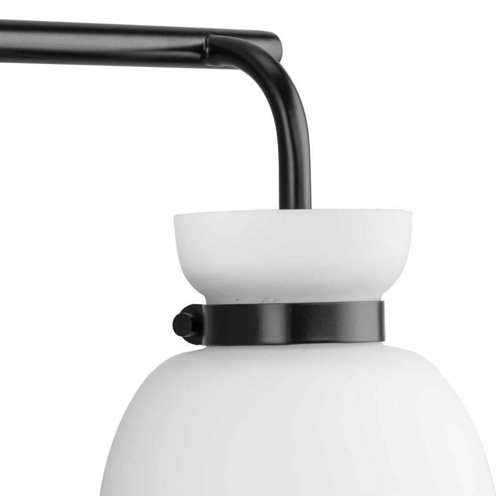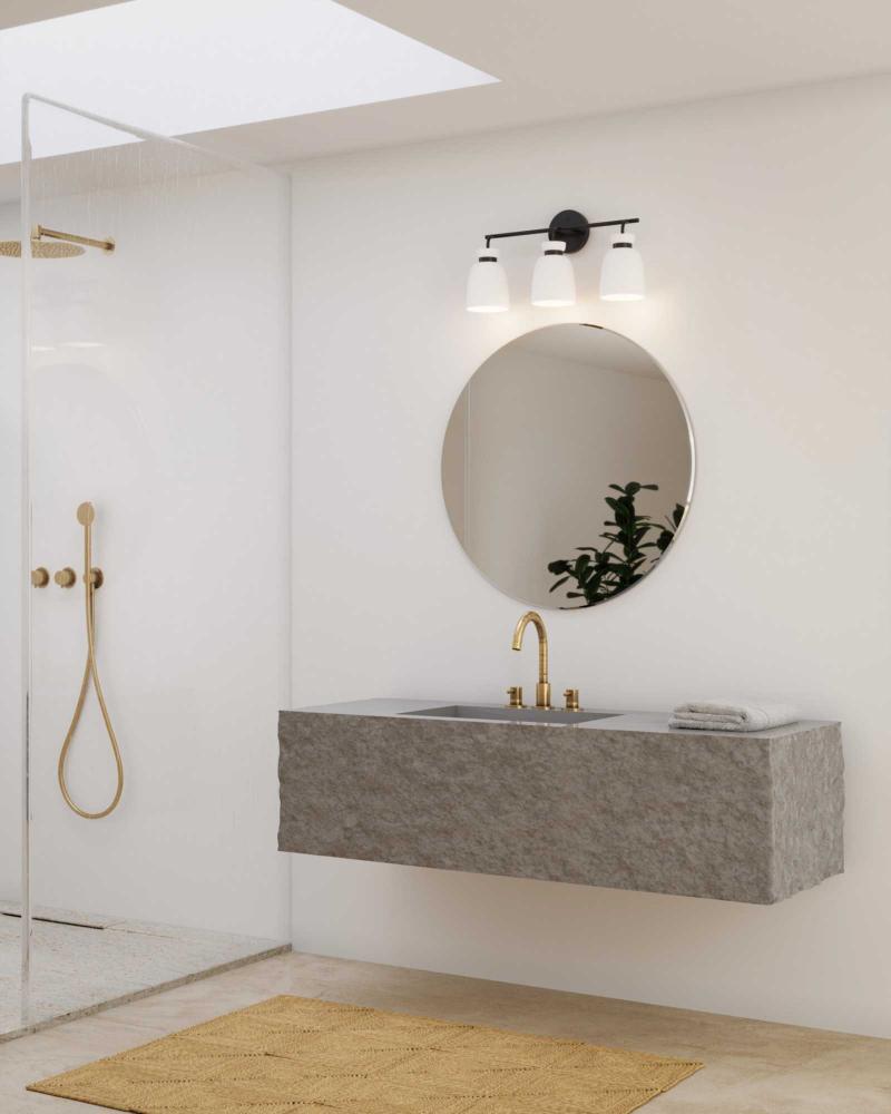 The Lexie Three-Light Vanity Light is full of spunk with a fresh new style for todays home. A slender minimalist frame finished in Matte Black supports opal glass shades with a distinctive cinched metallic collar.The versatile fixture can be mounted facing up or down, offering the perfect amount of illumination to the room.