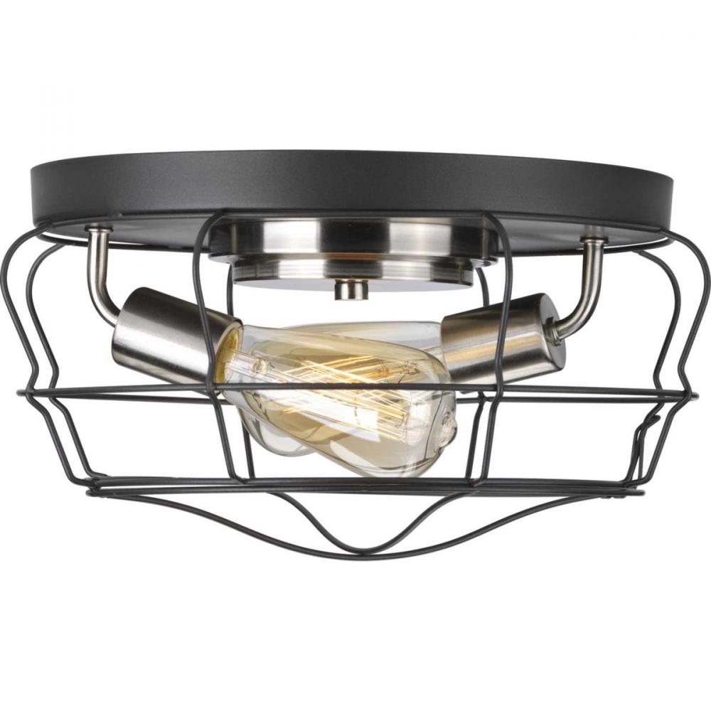 Inspired by industrial elements, Gauge two-light flush mount features an open cage design that's both functional and aesthetically appealing. Frame is comprised of a Graphite finished wire frame with Brushed Nickel accents. Hinged door provides easy access to change lamp.