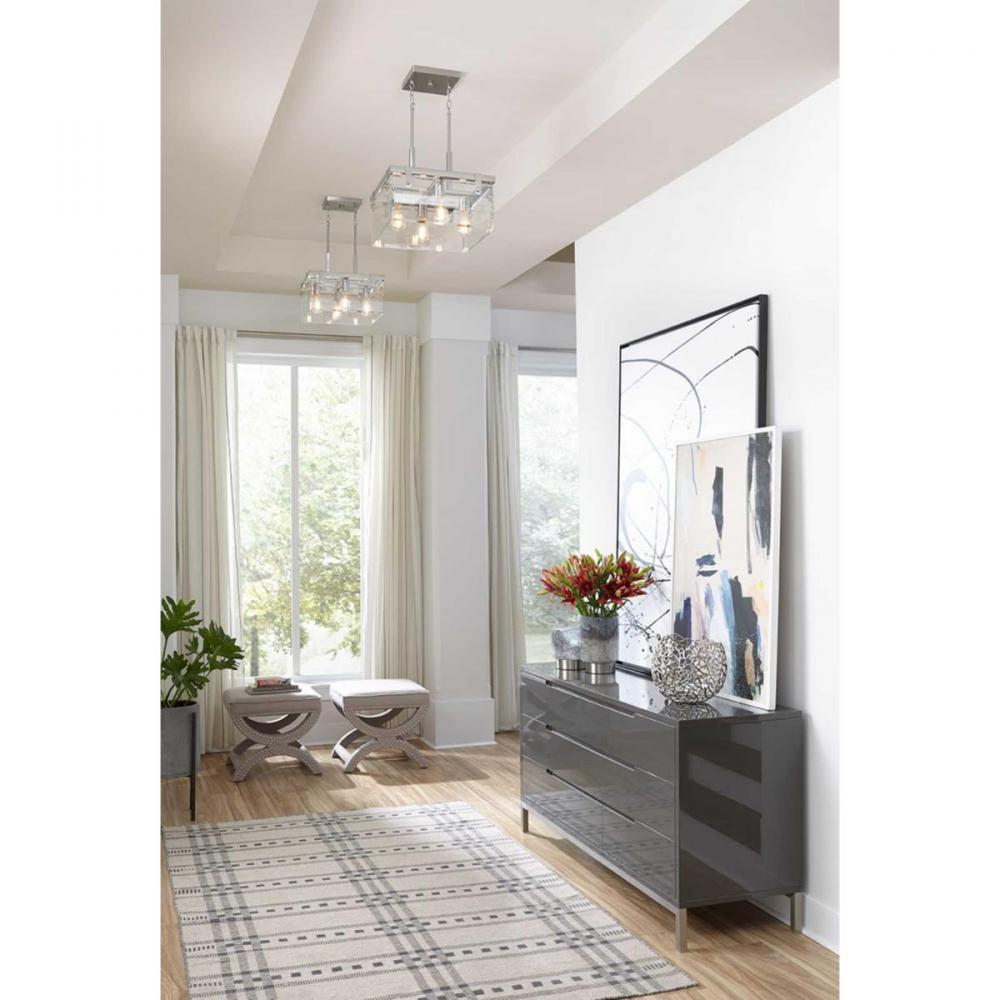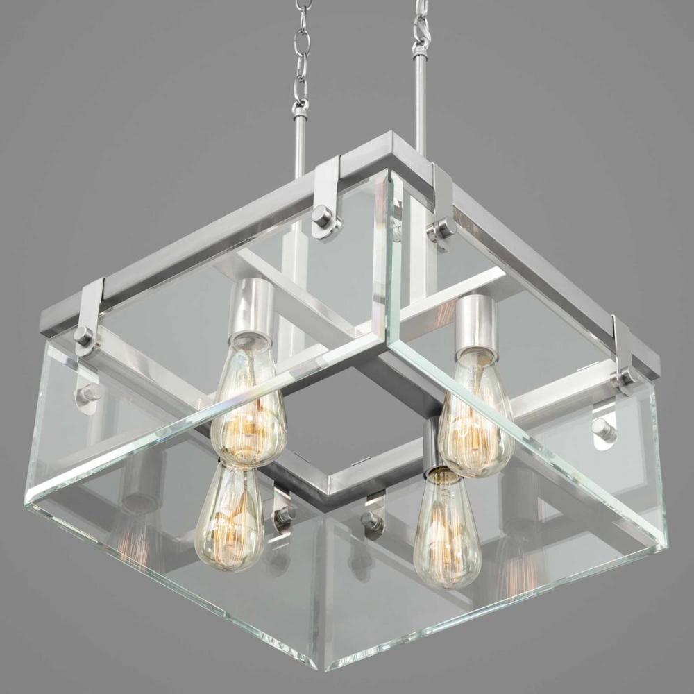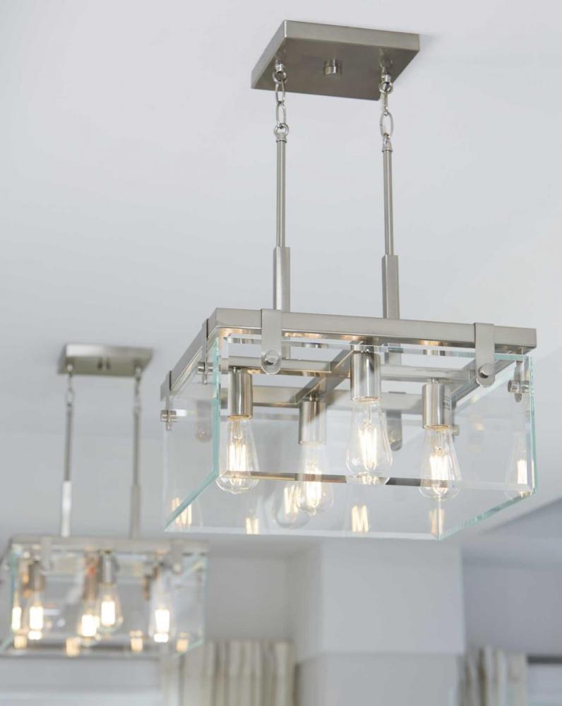 Inspired by modern architecture. Glayse features handsome details for variety of interior design styles. The frameless unbounded beveled glass creates beautiful light and reflection. The structure of Glayse is the focal point of the design, where form follows function. The four-light semi-flush convertible fixture is complimented by a Brushed Nickel finish.