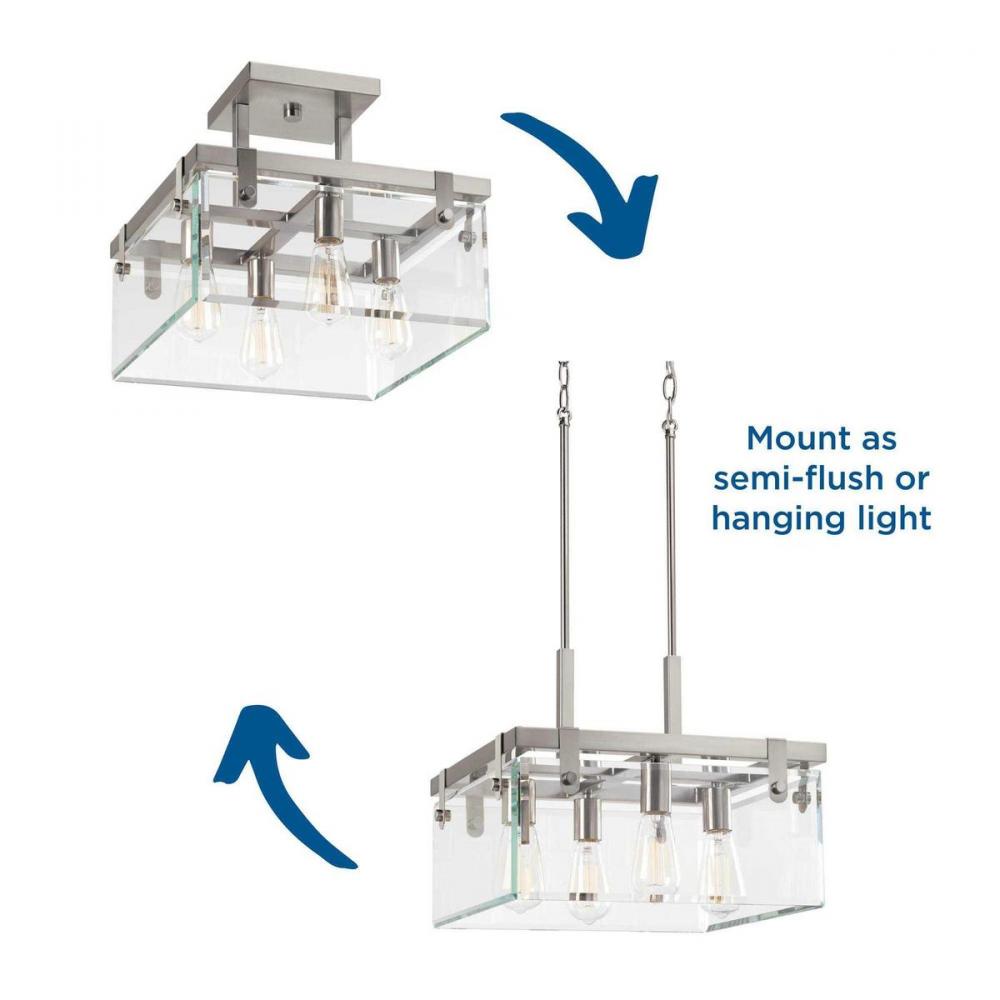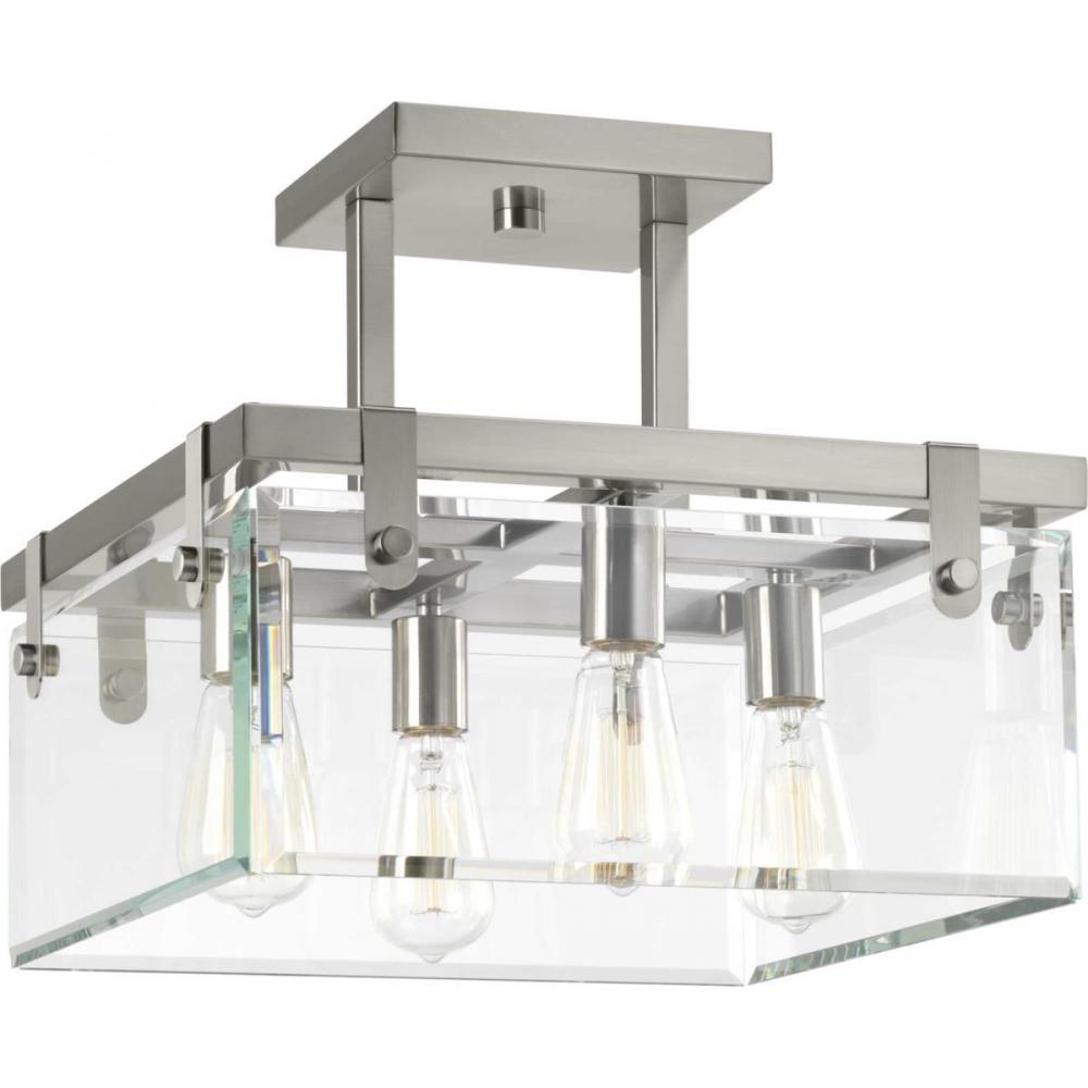 Inspired by modern architecture;The structure of Glayse is the focal point of the design, where form follows function;Four light semi flush convertible;Popular Brushed Nickel finish;The frameless unbounded beveled glass creates beautiful light and reflecti