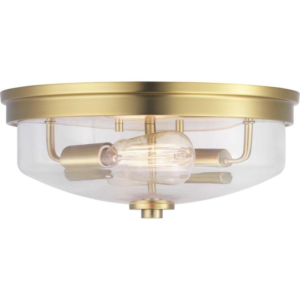 Inspired by modern architecture, Blakely two-light flush mount fixtures feature handsome details for variety of interior design styles. Clear glass highlights the lamp source and is finished in Brushed Bronze.