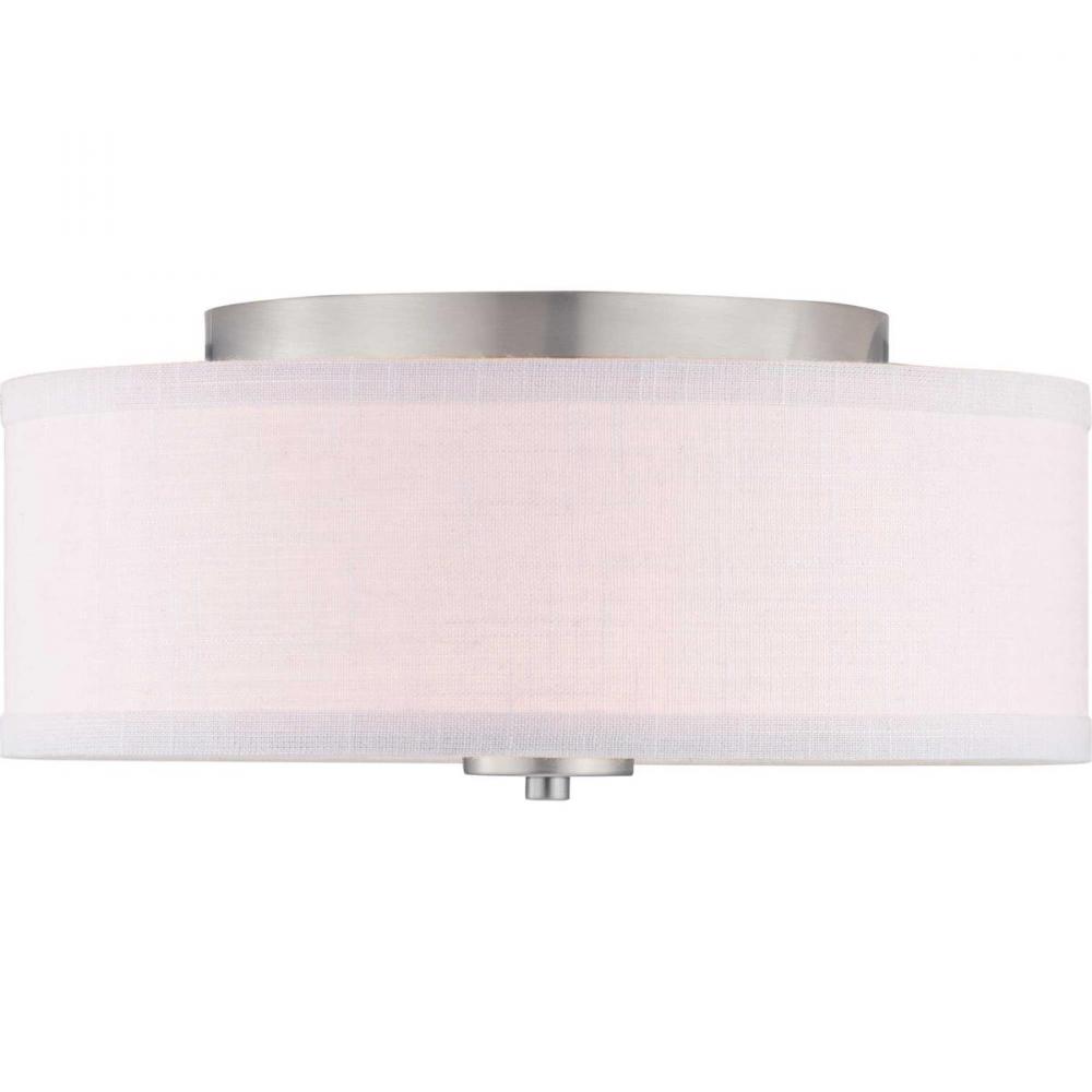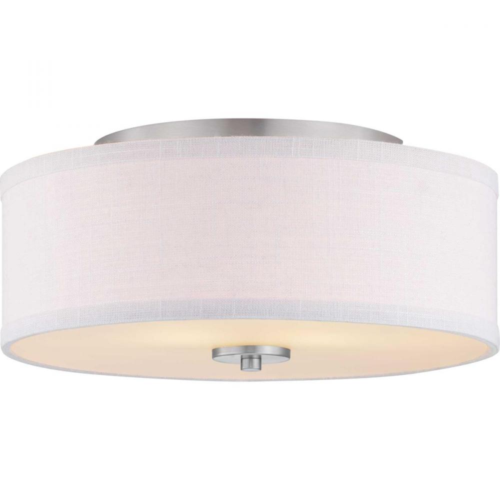 Harkening back to a simpler time, the Inspire Collection freshens traditional forms with flowing lines. The two-light flush mount fixture features an etched glass diffuser with a summer linen shade finished with Brushed Nickel details. This fixture is suitable for a variety of design styles, including Modern, Traditional and Farmhouse and the simple design is a perfect complement to a variety of fixture collections.