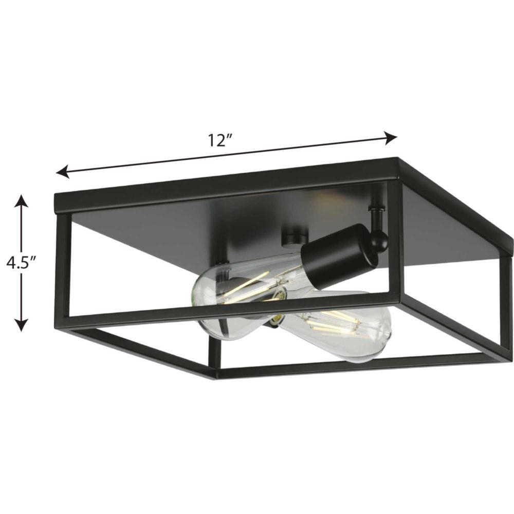 Inspired by a geometric simplicity, the Perimeter Collection 2-Light Matte Black Modern Flush Mount Ceiling Light. The square frame composed of clean, straight lines is coated in a classic matte black finish. Light sources peek from inside the crisp open-frame design that accentuates the light fixture's modern aesthetic.