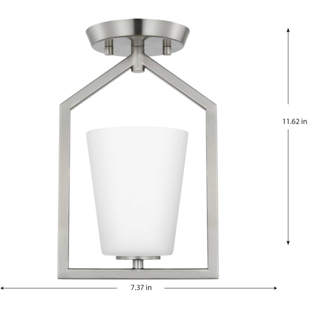 Elegantly extended, the Vertex semi-flush mount is composed of angular forms to create a bold design that perfectly complements halls, foyers and kitchens in modern interiors. Its distinctive silhouette is coated in a brushed nickel finish. An etched glass shade offers bright illumination to spaces below.