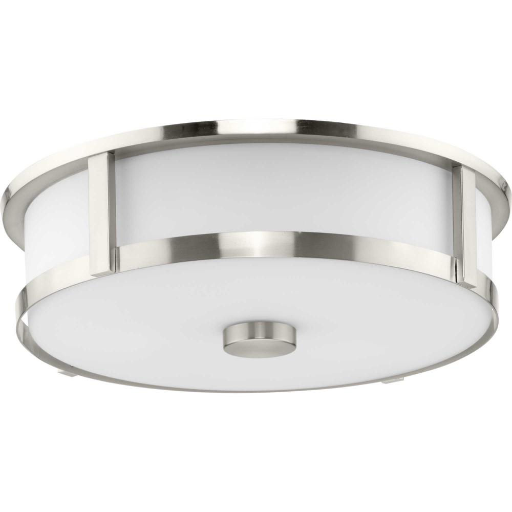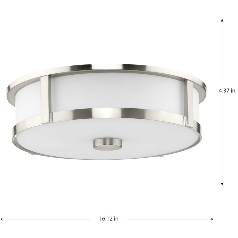 The Gilliam Flush Mount delivers an ethereal quality expressed by its slim circular silhouette finished in Brushed Nickel. Etched white curved glass enhances the ceiling light’s classic form with simple elegance. The 16 inch diameter light is perfect where a larger flush mount is needed.