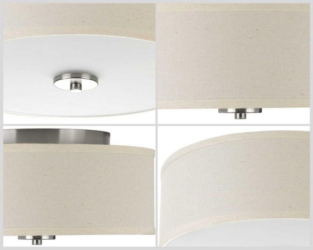 Harkening back to a simpler time, the Inspire Collection flush mount ceiling light freshens traditional forms with clean lines. The two-light brushed nickel semi- mount ceiling light features an etched glass diffuser with an off-white linen shade. This fixture is suitable for a variety of design styles, including transitional, traditional and farmhouse and the simple design is a perfect for a variety of locations throughout the home.