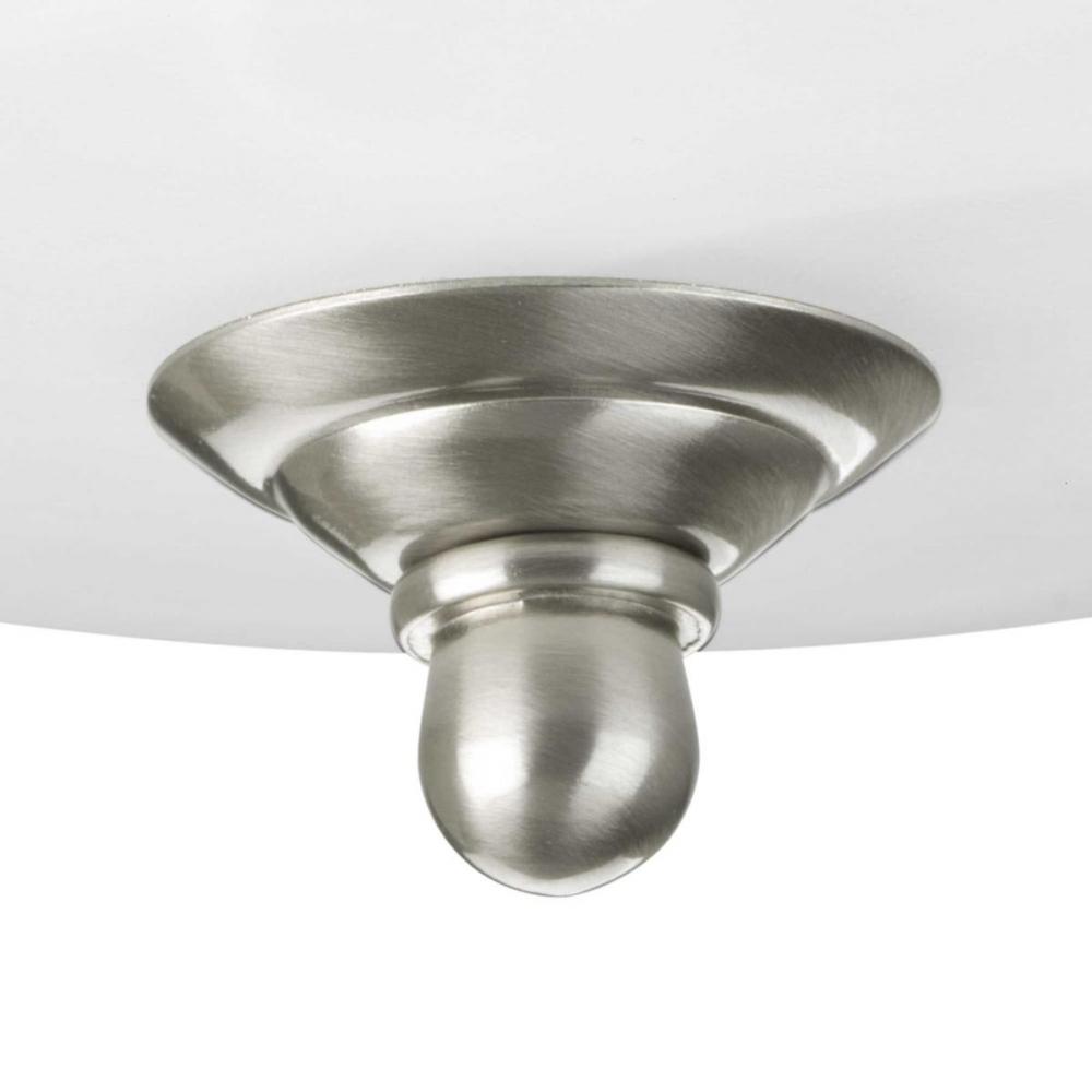 One-light 11" flush mount with dome shaped etched glass, solid trim and decorative knobs. Center lock-up with matching finial. Brushed Nickel finish.