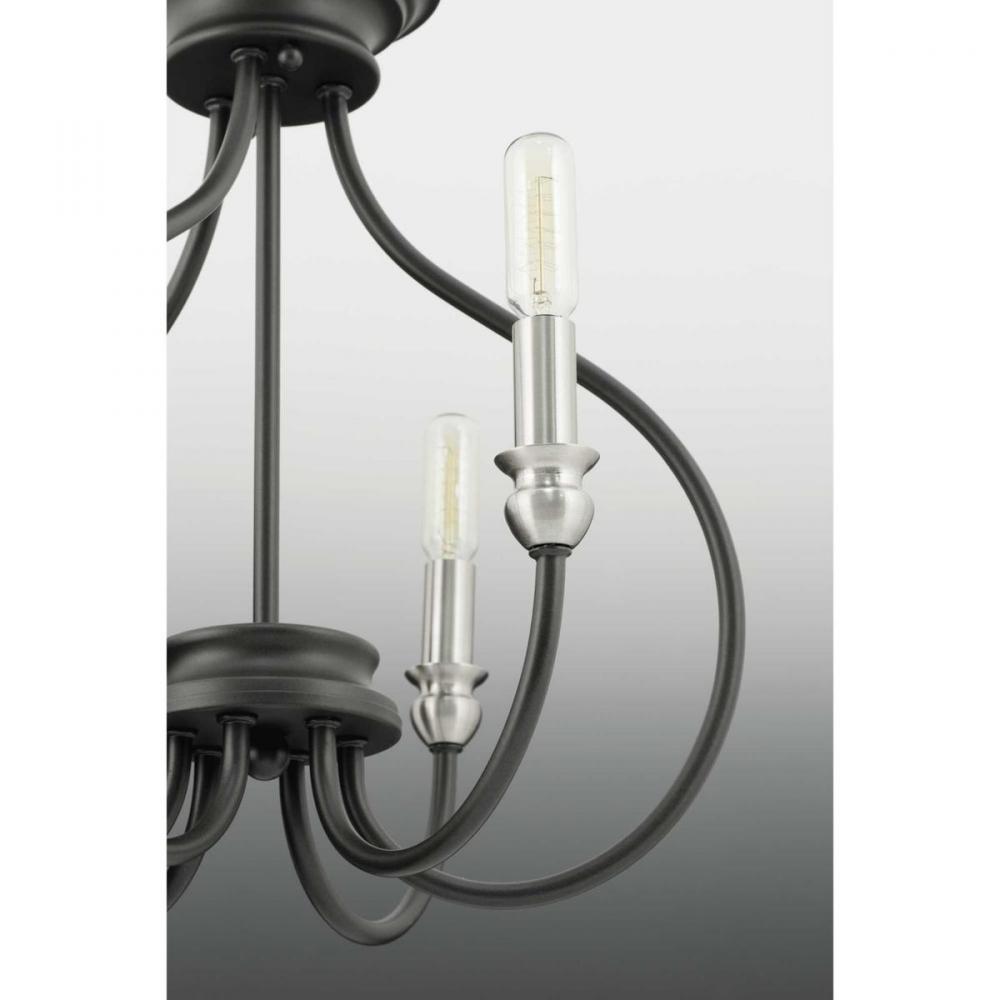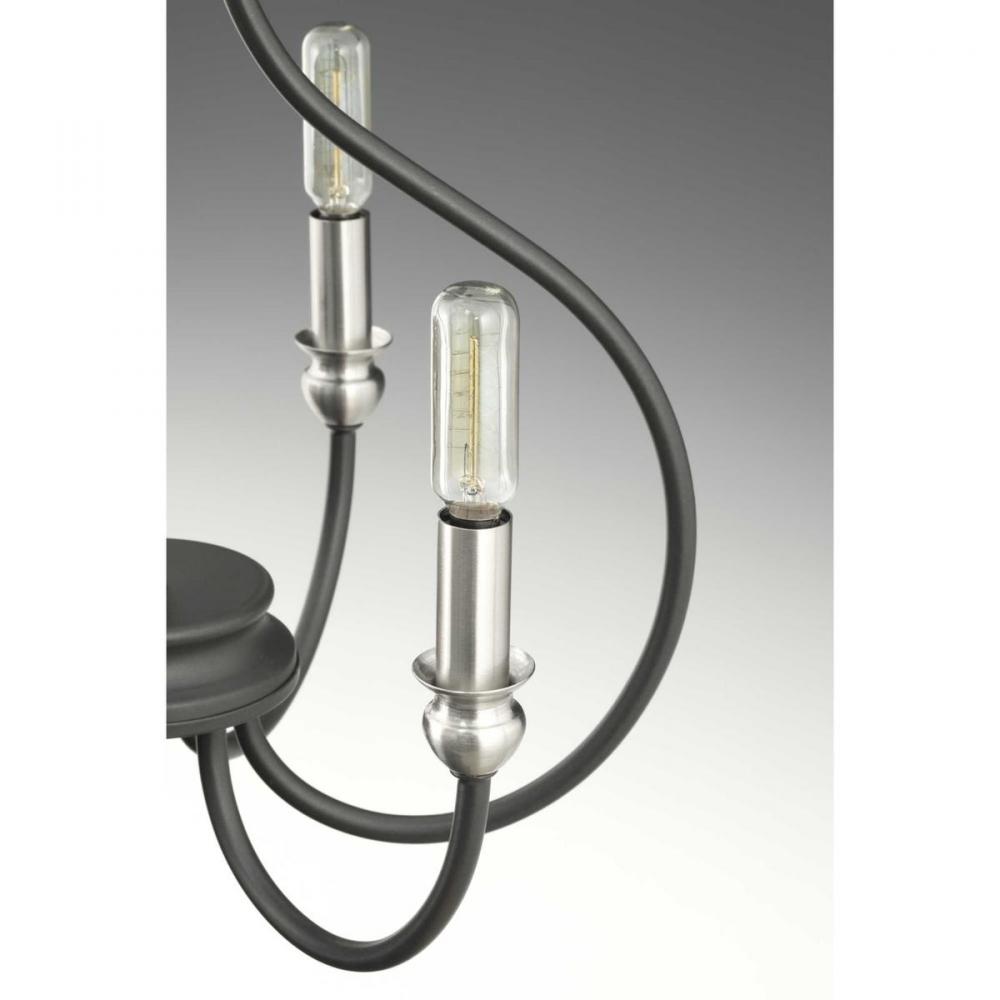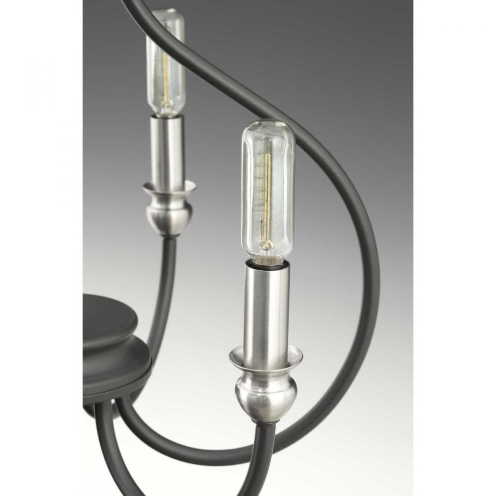 An updated traditional family, Whisp adds distinction to interior spaces. Candles with brushed nickel accents complement a gracefully scrolled frame in a cool Graphite finish. Four-light chandelier perfect for dining room and kitchens.