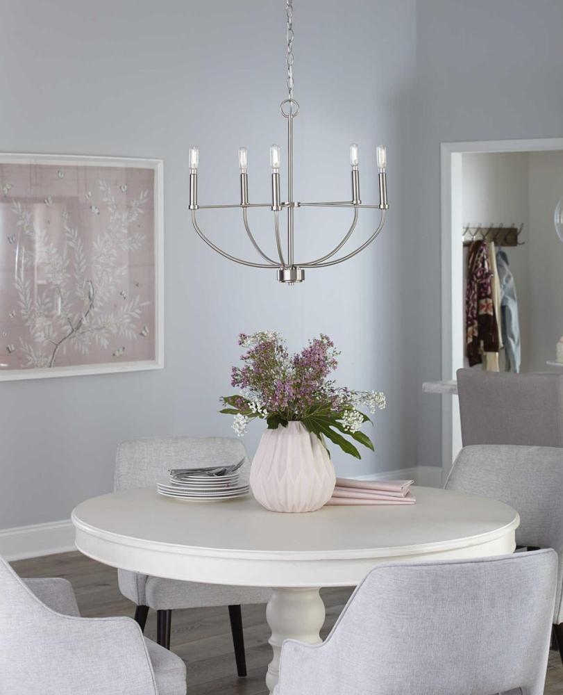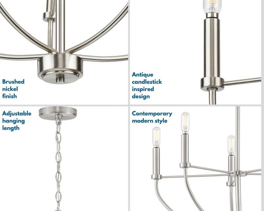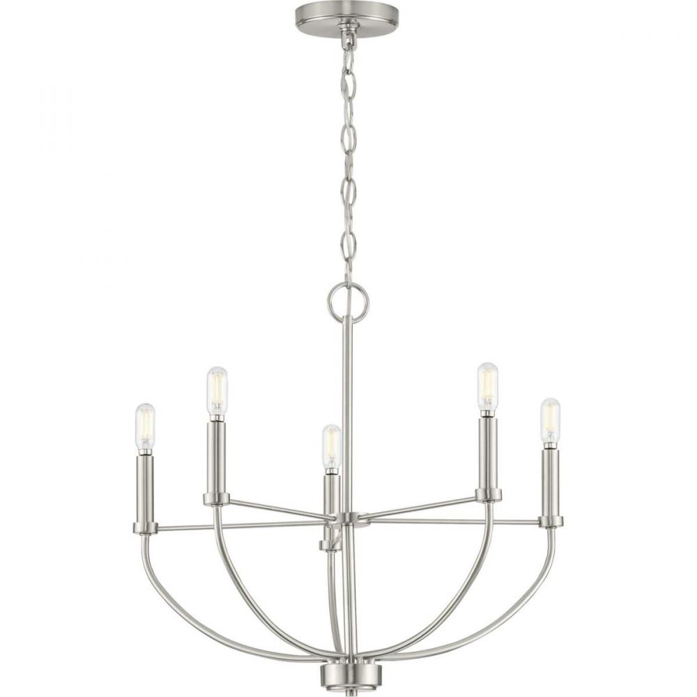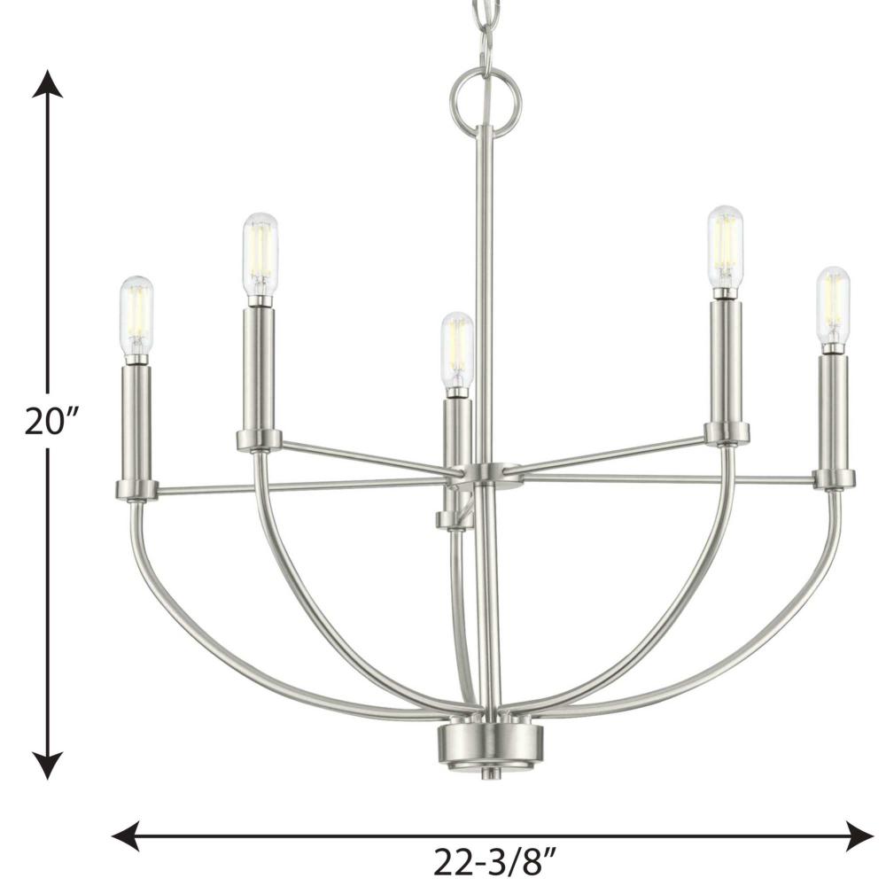 Transform your home with the gorgeous glow from the Leyden Collection 5-Light Brushed Nickel Farmhouse Chandelier. Light sources glow from atop light bases reminiscent of antique candlesticks arranged in a circular design for an elegant charming glow sure to provide any living space with generous illumination. The curved arms reaching up to hold the light bases from the round base at the bottom of the decorative column are all coated in a beautiful brushed nickel finish for a touch of modern character. Twisted metal spokes extend out from the center of the fixture to support the arms for extra visual interest.