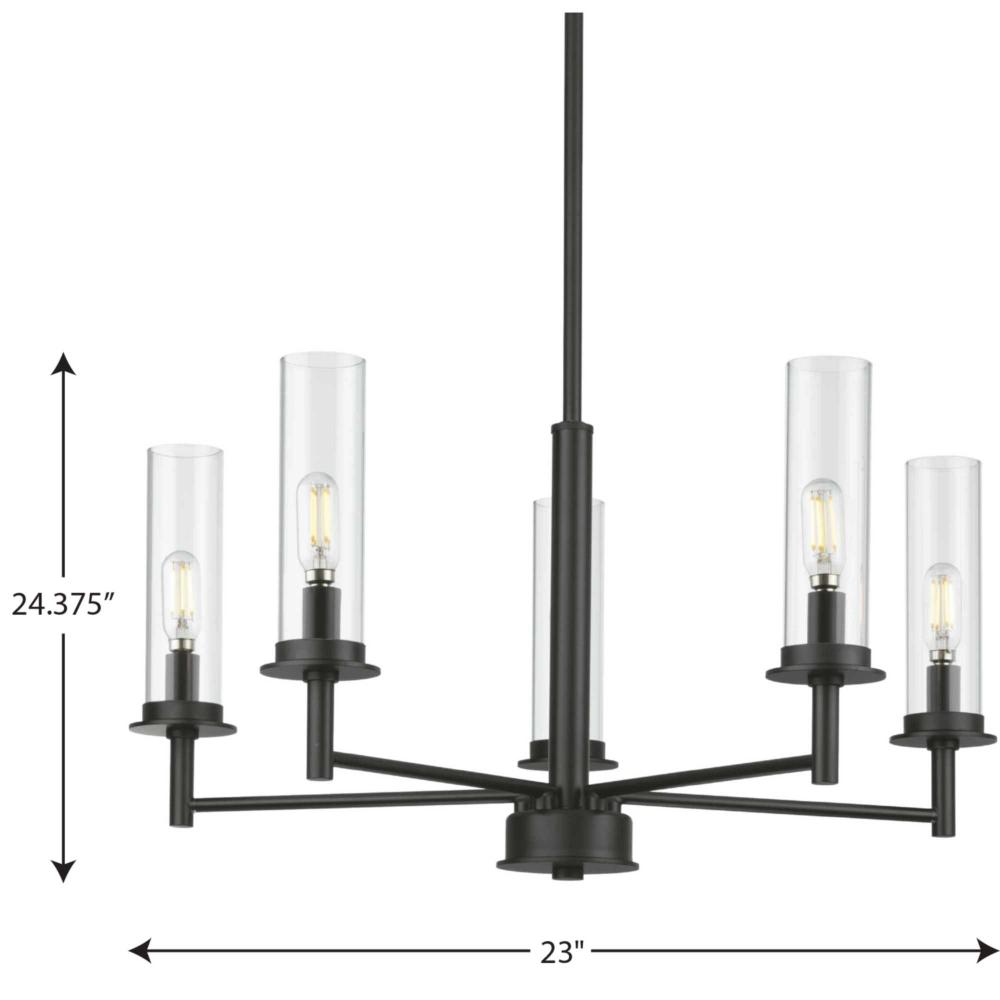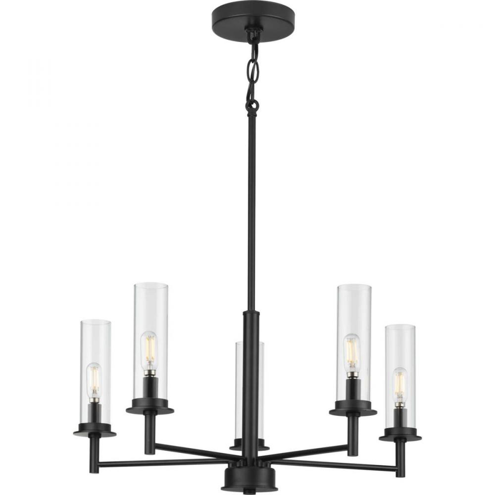 Balance the best of modern and traditional with the Kellwyn Collection 5-Light Matte Black Clear Glass Transitional Chandelier Light. The classic frame with crisp, clean lines is coated in a beautiful matte black finish. Light sources glow from inside cylindrical glass shades that add a touch of luxury to the design.