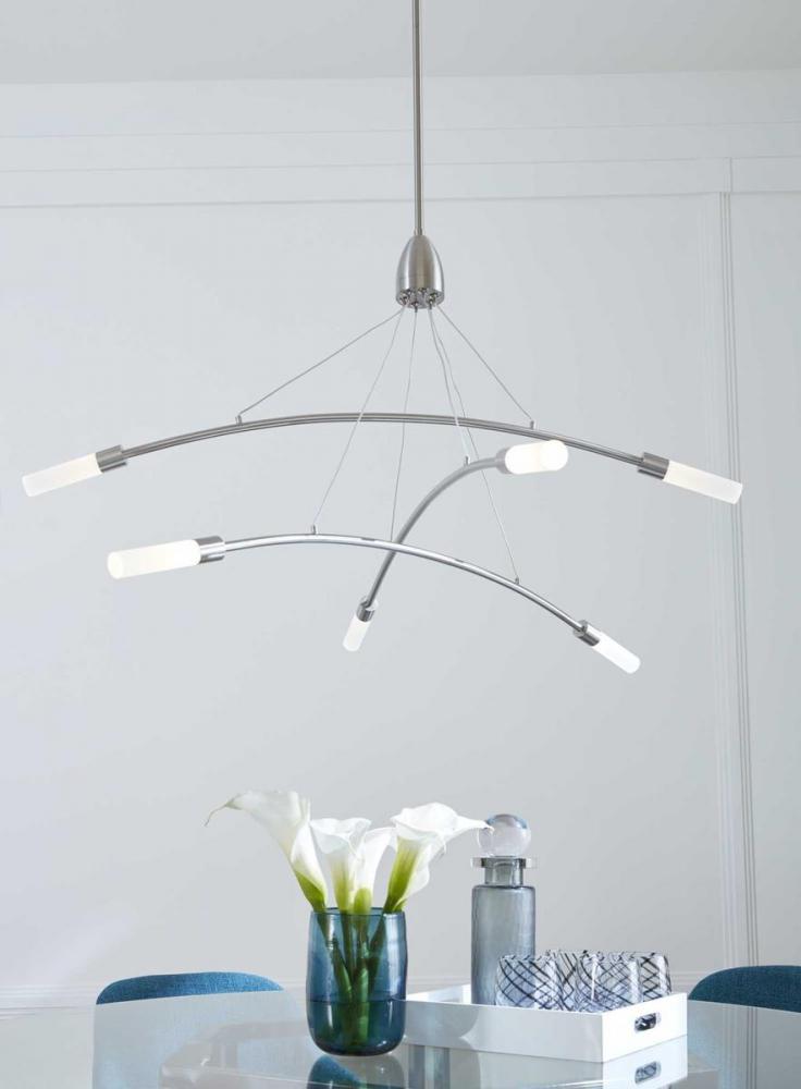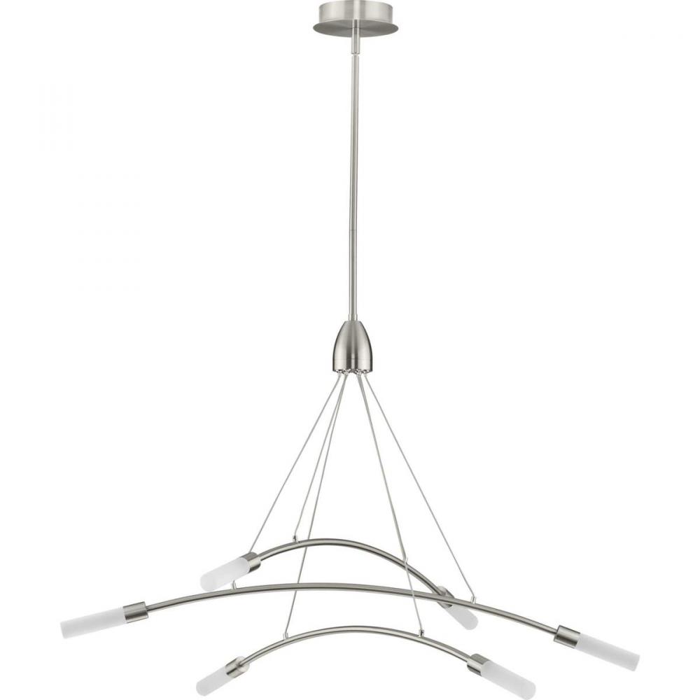 Manifest a futuristic effect with the Kylo LED Collection 6-Light Brushed Nickel Frosted Acrylic LED Modern Chandelier Light. Sleek metal bars coated in a beautiful brushed nickel finish and attach to steel cables suspended from a central stem for an asymmetrical form sure to add drama to a room's design. Cables can be individually adjusted for a custom design. Each metal bar is capped with crisp frosted shades for soft tubes of seamless light.