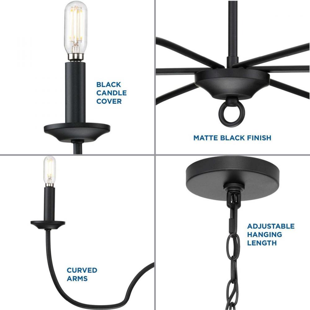 Ideal for a dining room, great room, or bedroom;Perfect for farmhouse style settings;Classic matte black finish;Incorporate vintage or contemporary bulbs;One 72-inch chain is included to customize for various ceiling heights;Use 6 candelabra base bulbs tha