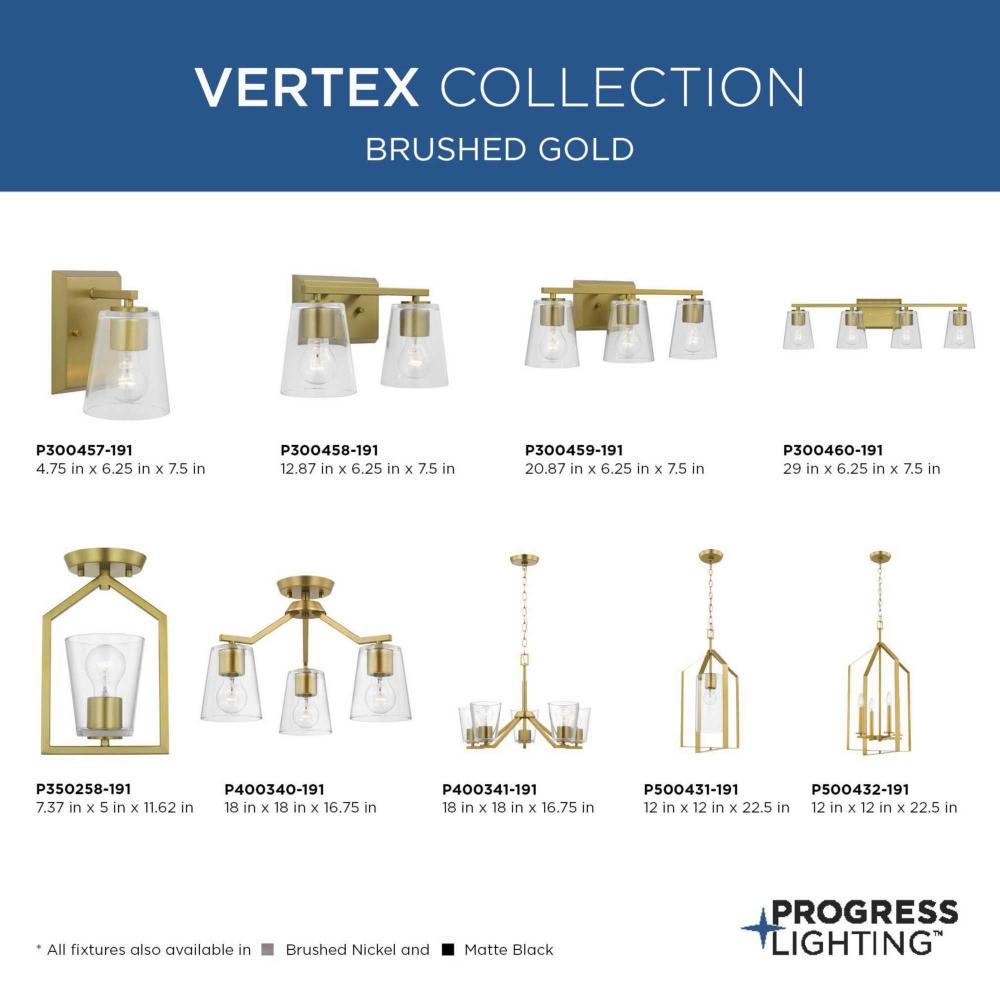 Elegantly extended, the Vertex convertible chandelier is composed of angular forms to create a bold design that perfectly complements halls, foyers and breakfast nooks in modern interiors. Its distinctive silhouette is coated in a soft brushed gold finish. A clear glass shade offers bright illumination to spaces below. This versatile fixture can be converted to a chandelier using the included 48 inches of chain or installed as a semi-flush mount fixture.