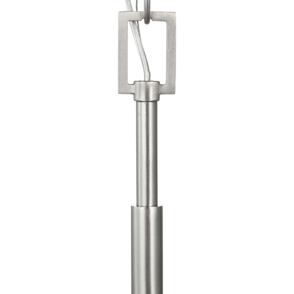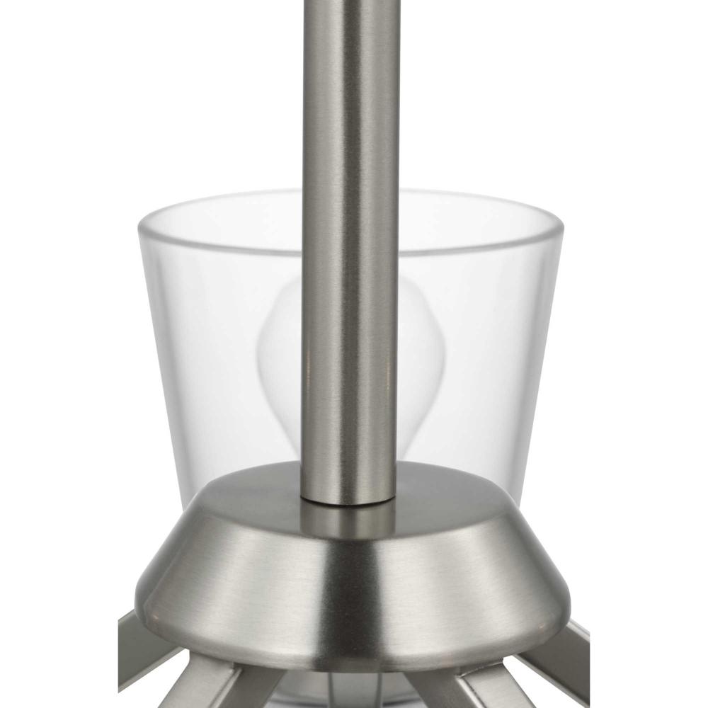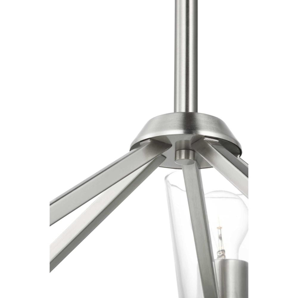 Elegantly extended, the Vertex chandelier is composed of angular forms to create a bold design that perfectly complements dining rooms and living rooms in modern interiors. Its distinctive silhouette is coated in a soft brushed nickel finish. A clear glass shade offers bright illumination to spaces below. Customize the chandelier's hanging height to your ceiling using the Included 48 in. of chain for a variety of ceiling heights and sloped ceilings.