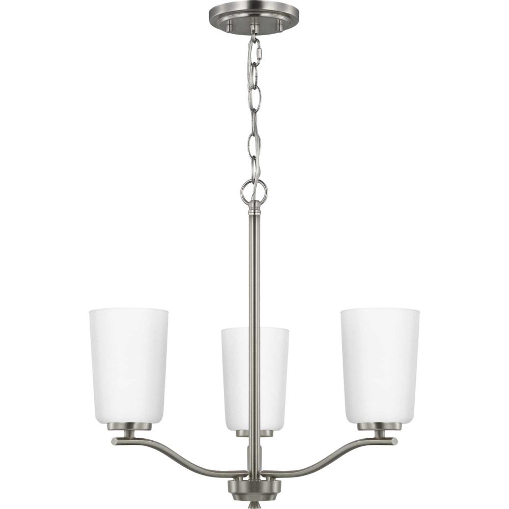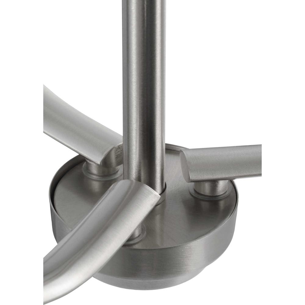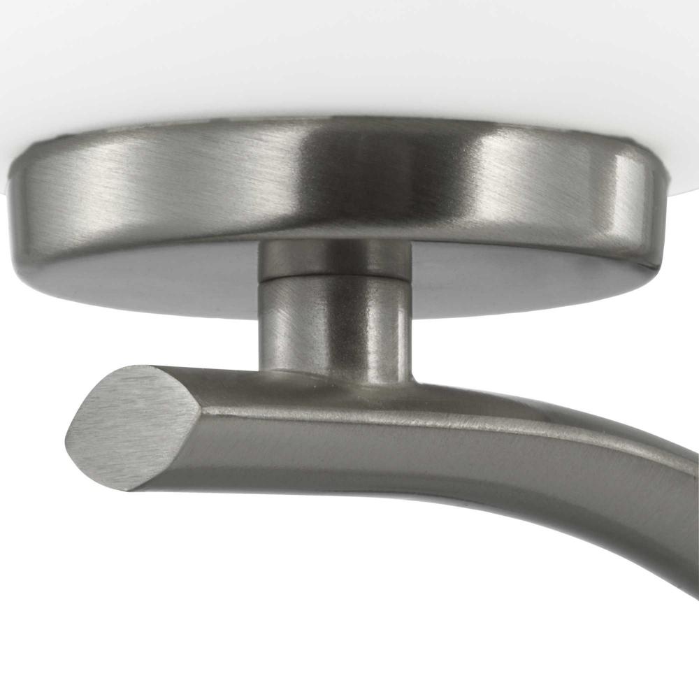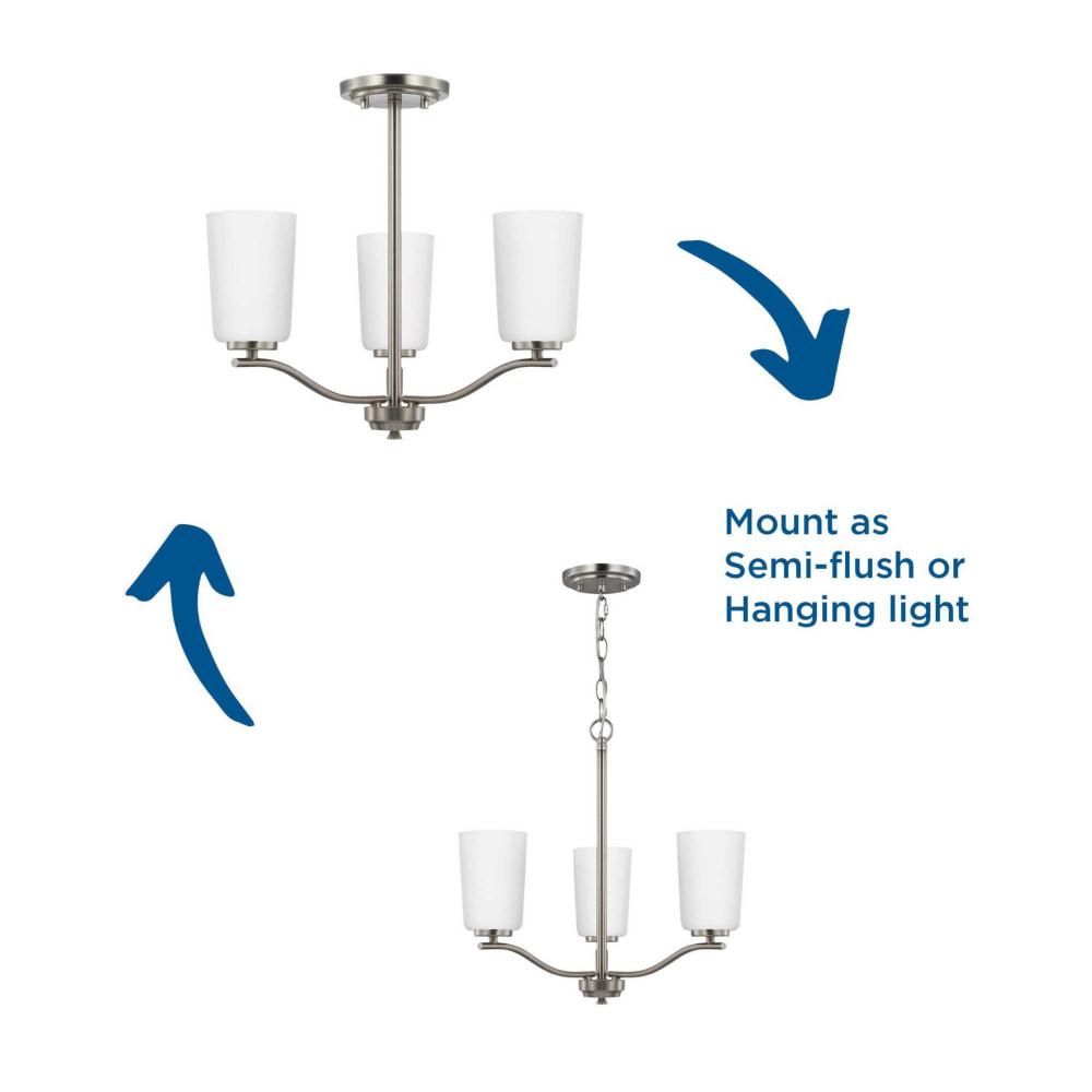 Fundamentally modern but with a traditional twist, the Adley semi-flush convertible chandelier combines etched white glass shades with a curved arms and simple, straight bars finished in brushed nickel. This light is an elegant choice for illuminating kitchens and breakfast nooks in transitional settings and contemporary settings. The fixture has 48 in. of chain to customize it for a variety of ceiling heights and can be used on a sloped ceiling.
