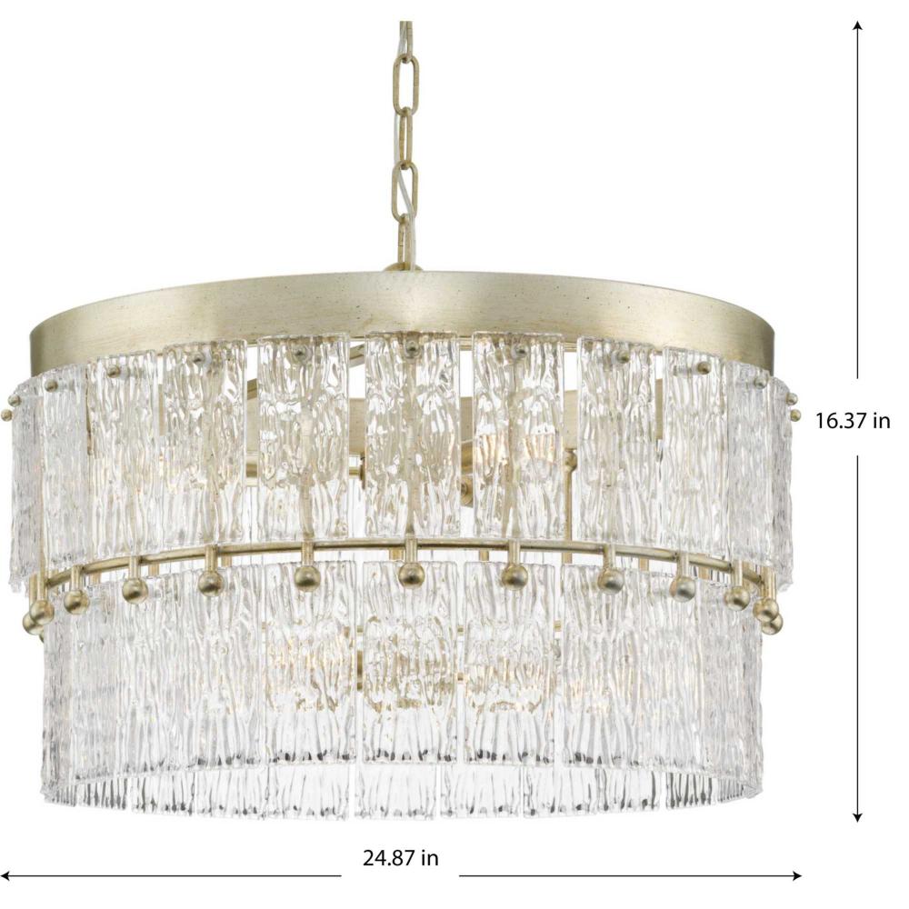 Add glamour to your home with the elegant Chevall Collection. Layers of distinctive artisanal glass encircle a richly burnished, Gilded Silver frame, creating a chandelier that offers a luxurious lighting experience. Glimmering illumination creates a sparkling ambiance that fills the room. This fixture is part of the Progress Lighting Design Series, a lighting collection offering fashionable styles and affordable luxury lighting for the home.