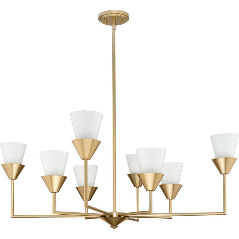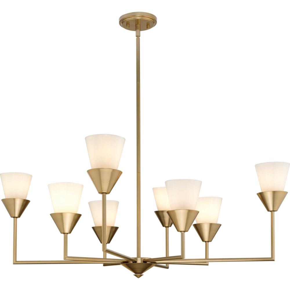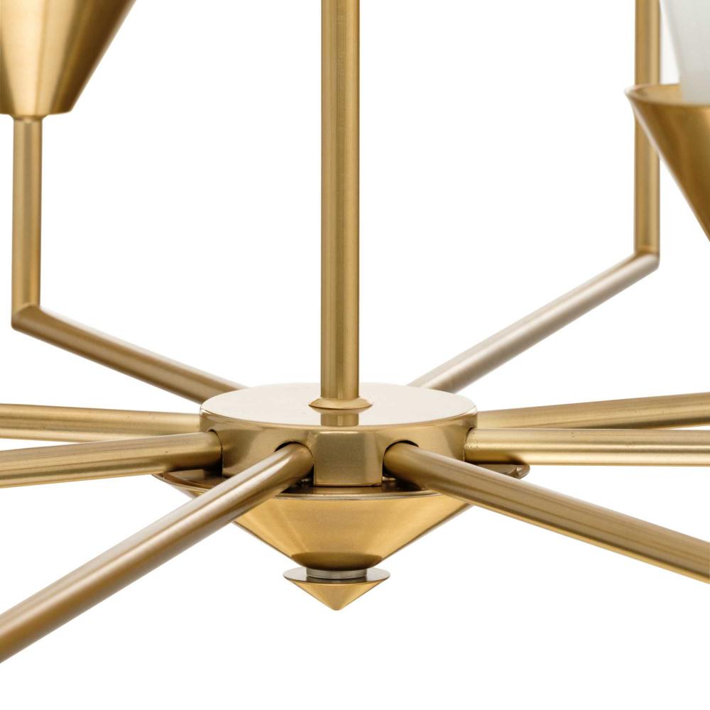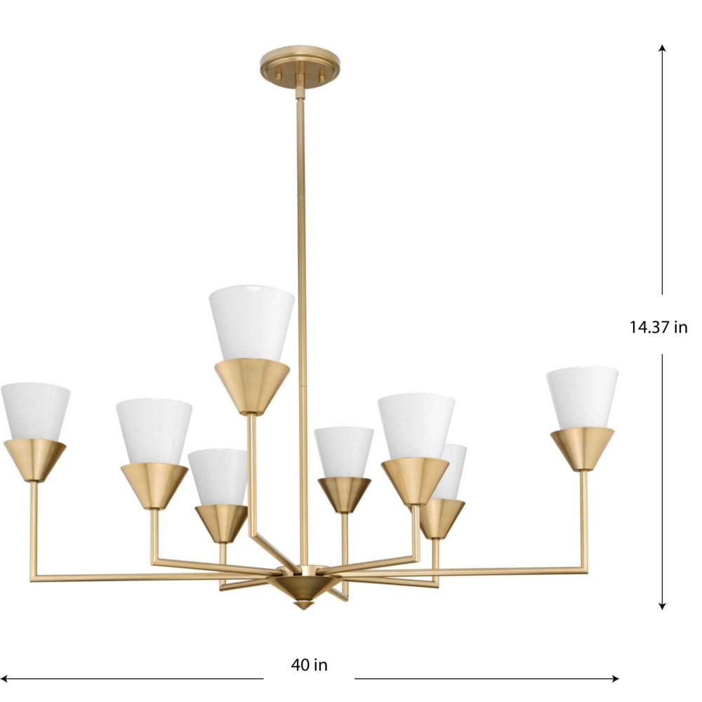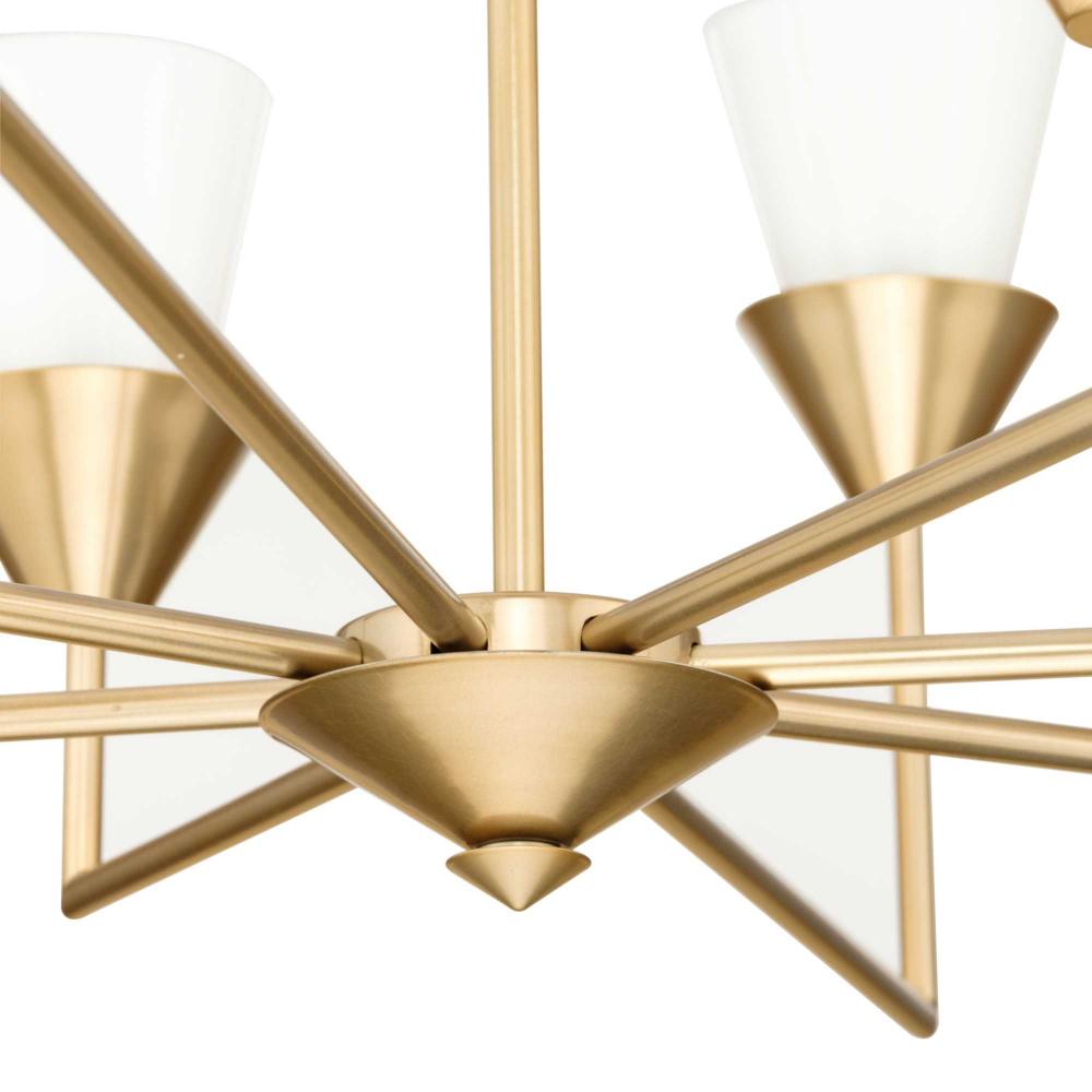 The Pinellas Chandelier gets to the point with a modern expression of a timeless form. The signature dual conical motif has the elements artfully nested together to provide a pleasing diffusion of light from its opal glass shades. This fixture is part of the Progress Lighting Design Series, a lighting collection offering fashionable styles and affordable luxury lighting for the home.