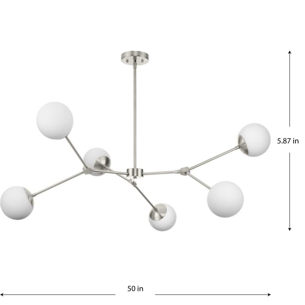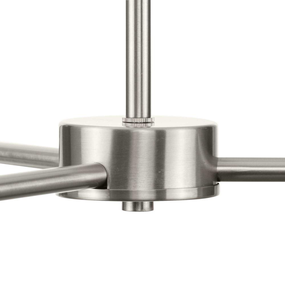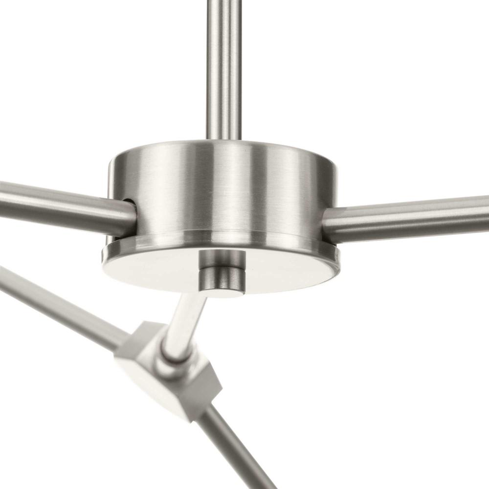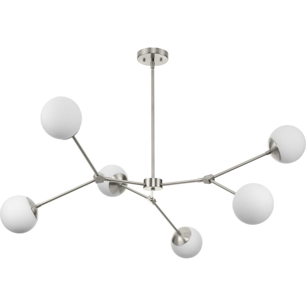 Modern and organic inspirations elegantly meld together in Haas. A bold linear frame finished in Brushed Nickel branches out to embrace smoothly etched opal glass globes that imbue rooms with soft illumination, and fits beautifully into timeless modern, mid-century modern and contemporary settings. The flexible arms of this fixture allows the fixture to be positioned flat or at an angle giving the ability to customize the look. This fixture is part of the Progress Lighting Design Series, a lighting collection offering fashionable styles and luxury lighting for the home.
