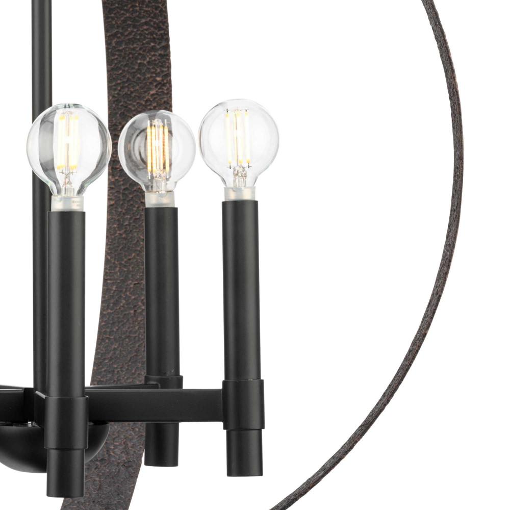 Its rustic frame is finished in a textured Iron Copper with Matte Black light cluster