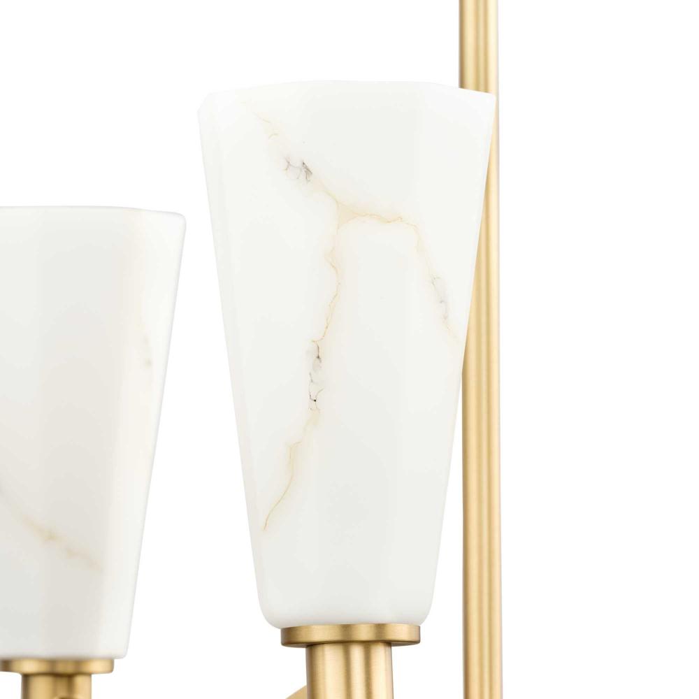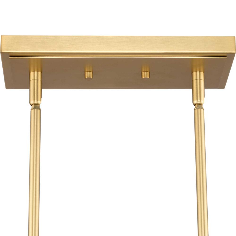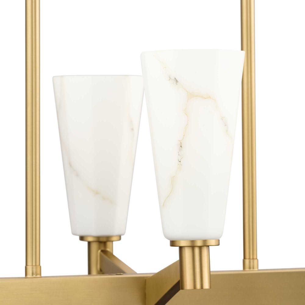 The Tosca Collection exudes a sense of motion from impressively scaled, gracefully tapered arms that transcend traditional design boundaries. The Brushed Bronze linear chandelier holds geometric glass shades crafted with a faux alabaster finish that radiate patterns of light and shadow, adding depth and warmth that enchant any room. This fixture is part of the Progress Lighting Design Series, a lighting collection offering fashionable styles and luxury lighting for the home.