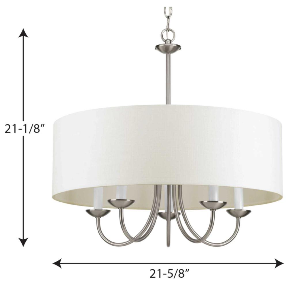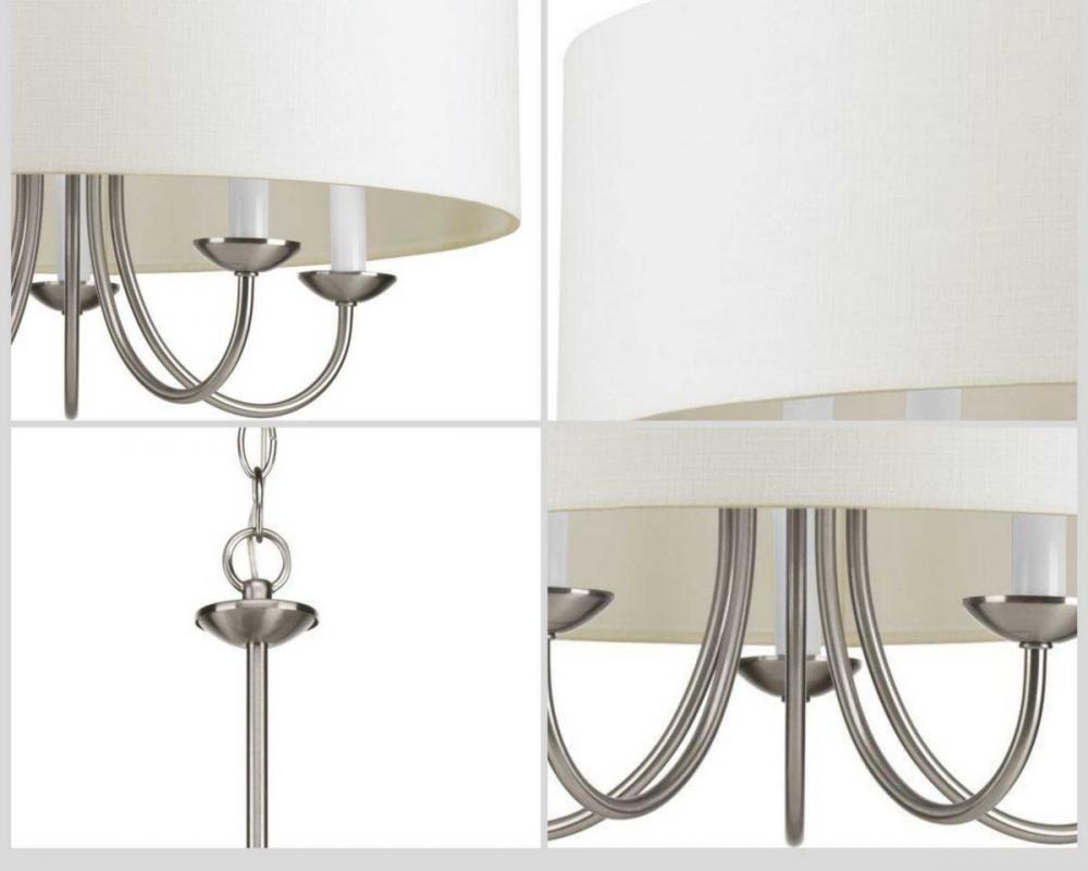 Freshen your home décor with a chandelier from the Drum Shade Collection. Light sources glow from within a crisp white textured fabric shade that gives a country-casual feel to this classic light fixture. The gently curving arms are coated in a beautiful brushed nickel finish. A perfect piece for gracing an entryway or exuding a light over a meal at your dining table or breakfast nook.