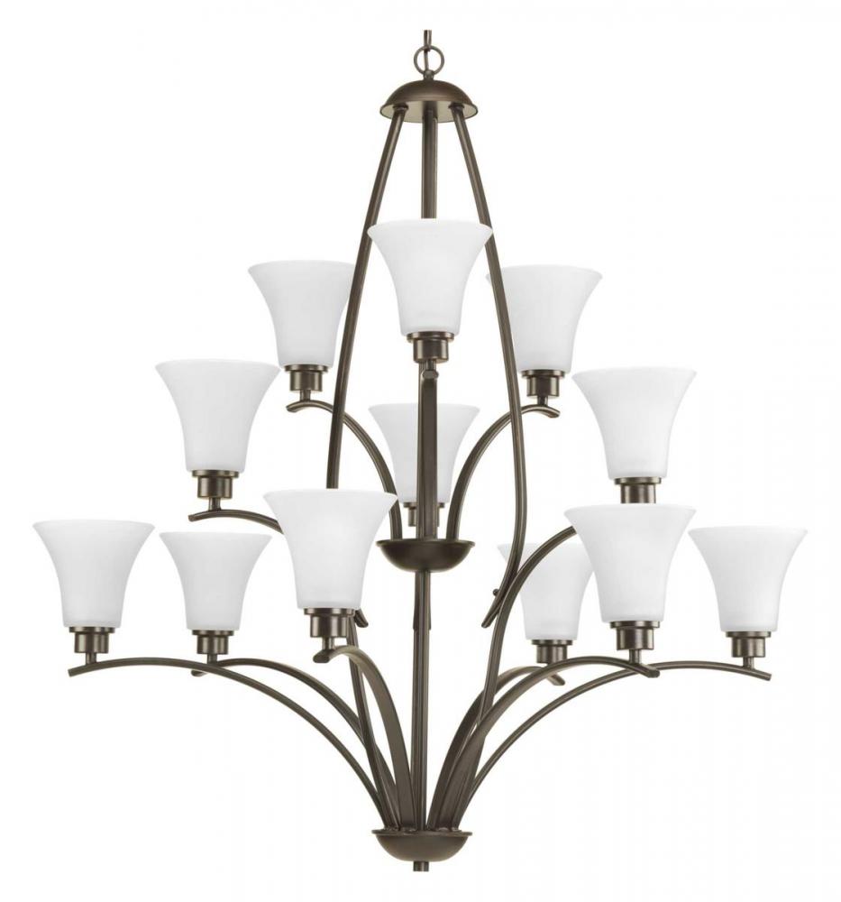 Gleeful simplicity defines this twelve-light, three-tier chandelier from the Joy Collection. Refreshing and fashionable arcing forms of Antique Bronze metal arms enhance the etched white fluted glass. Coordinating fixtures from this collection let you decorate an entire home with confidence and style. Unique stem-hung construction carries the clean line all the way to the ceiling and, for sloped ceilings, ten feet of 9 gauge chain is provided to allow the fixture to hang straight and level.
