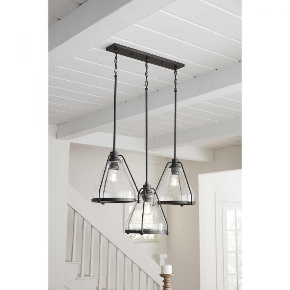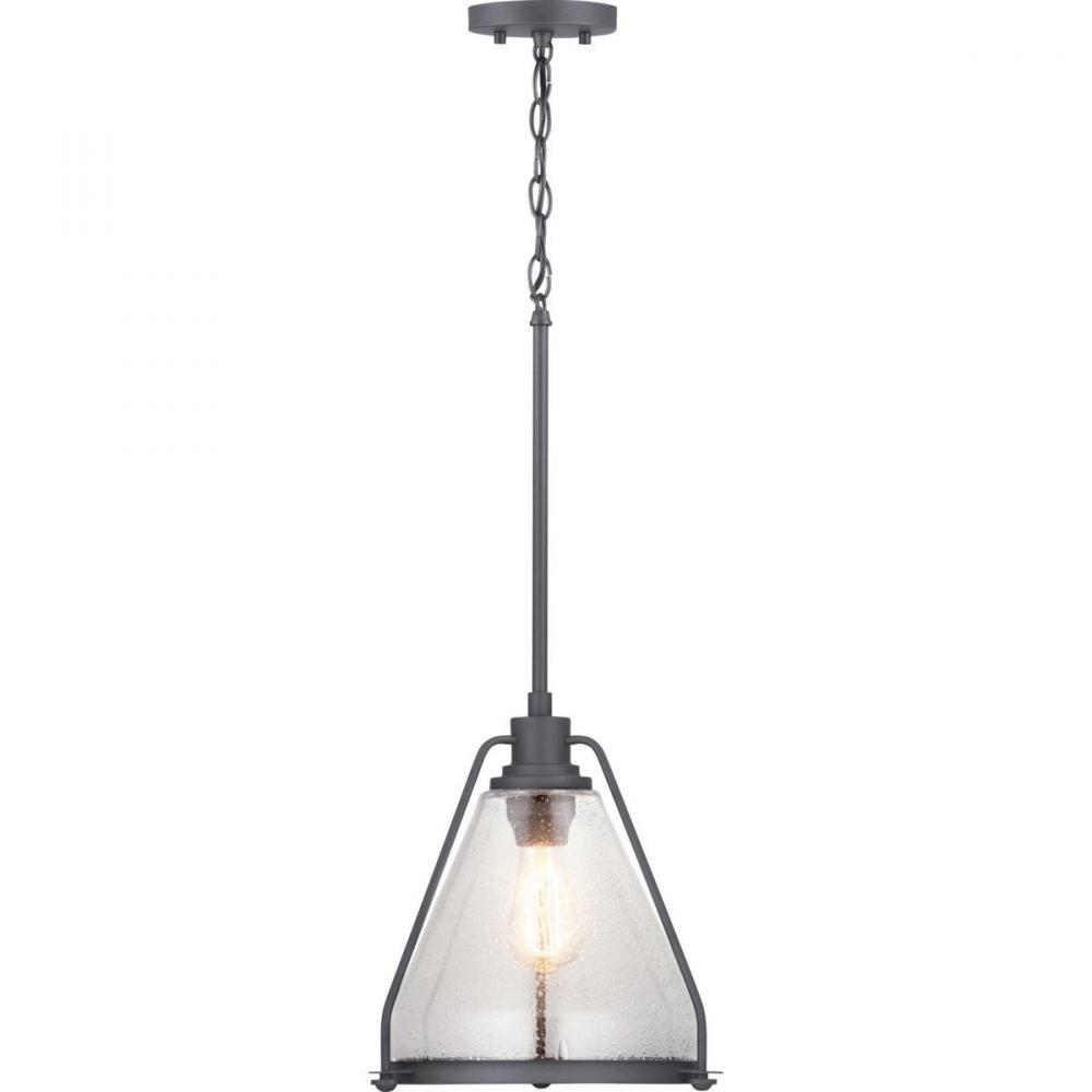 Range features a classic triangular clear seeded glass shade. The simple geometric glass is outlined with a Graphite slender frame and finished with a bottom metal accent ring. Simple and stylish, this versatile style is suitable for a variety of designs, such as Modern, Farmhouse and Urban Industrial.