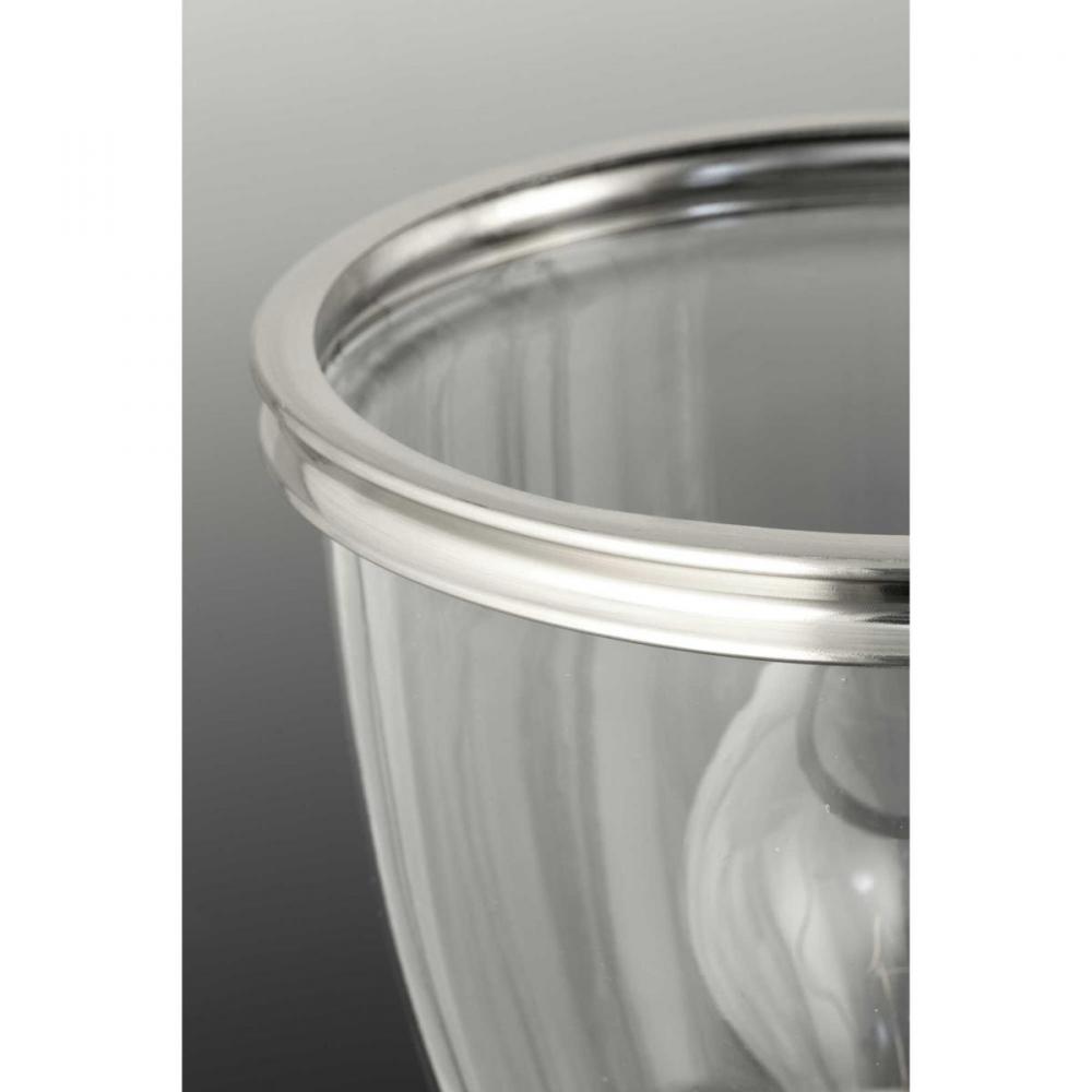 Clean comfortable forms with gentle curves are highlighted in Saluda;Softly shaped clear glass shades are accented with a banded ring and nestled on a socket cup to complete the form.;Clear glass shade;Brushed Nickel finish;1-light mini-pendant;Uses 1, 60-