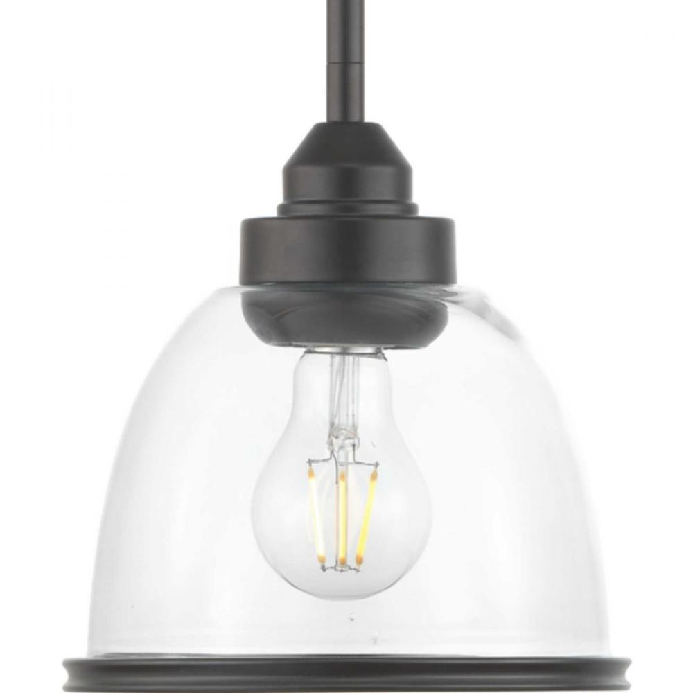 Clean comfortable forms with gentle curves are highlighted in Saluda;Softly shaped clear glass shades are accented with a banded ring and nestled on a socket cup to complete the form.;Clear glass shade;Antique Bronze finish;1-light mini-pendant;Uses 1, 60-