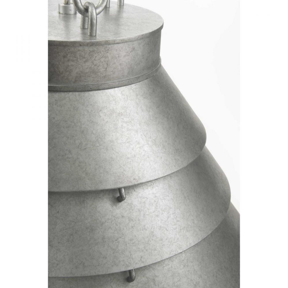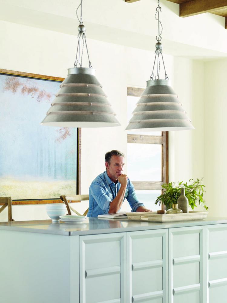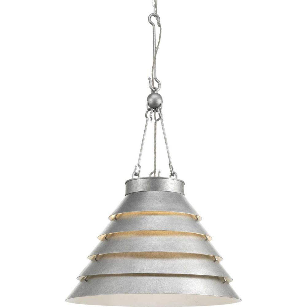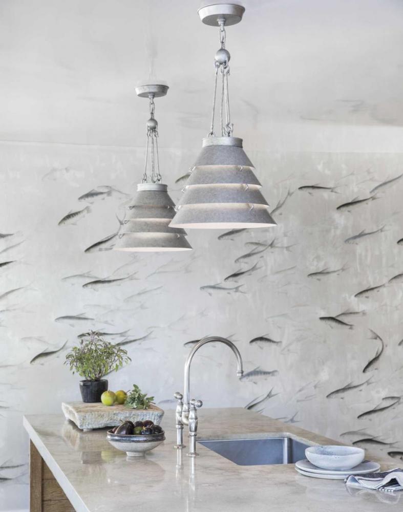 Like gentle waves lapping the sandy shore, the large Surfrider pendant has tiers of metal curves converging in an ever-widening circle. Oversized hooks suspended from a simple orb surround a floating braided metal cable, beautifully marrying form and function for an industrial meets modern-minded point of view. This family of fixtures is part of the Jeffrey Alan Marks Point Dume™ lighting collection which celebrates a curated mix of yesterday and today, distilling both industrial and artisanal influences. Galvanized finish of neutral silver-gray creates an environment that feels equally soothing and inviting.