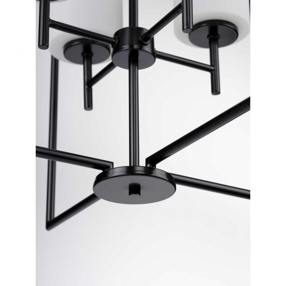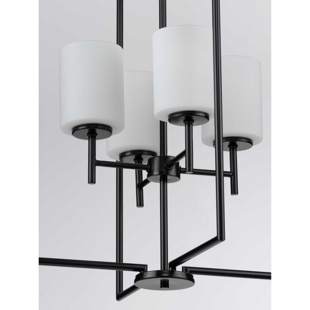 Welcome guests with elegance and class as the Reply four-light pendant washes its soft glow over a foyer, dining table, or large kitchen island. The timeless, rectangular silhouette with a statement-making Black finish extends above and below the white, etched glass shades assembled at the fixture’s center, making it an excellent piece for transitional and modern settings.