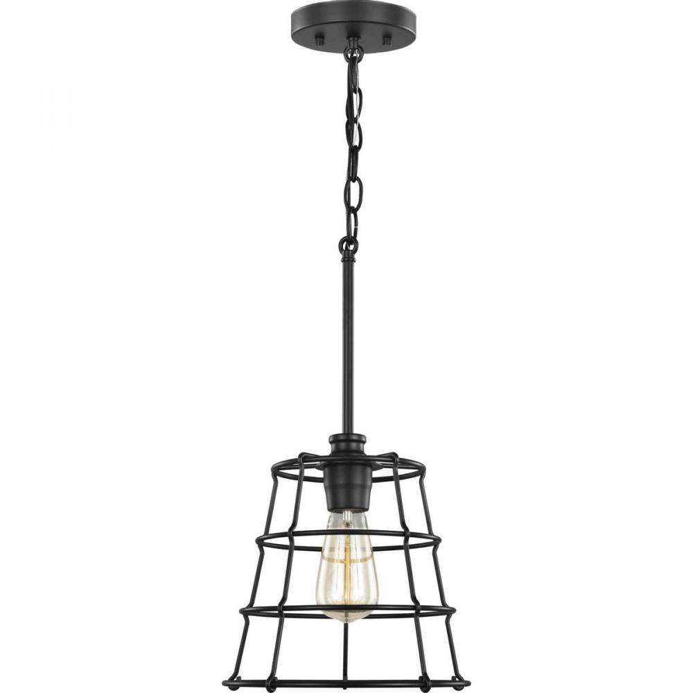 A simple egg-basket-inspired wire-frame shade grants the light fixture its signature country-look.;Inside the open-cage shade is a vintage light bulb coated in a farmhouse-style black finish.;Foster a down-home décor theme with this rustic mini-pendant.;I