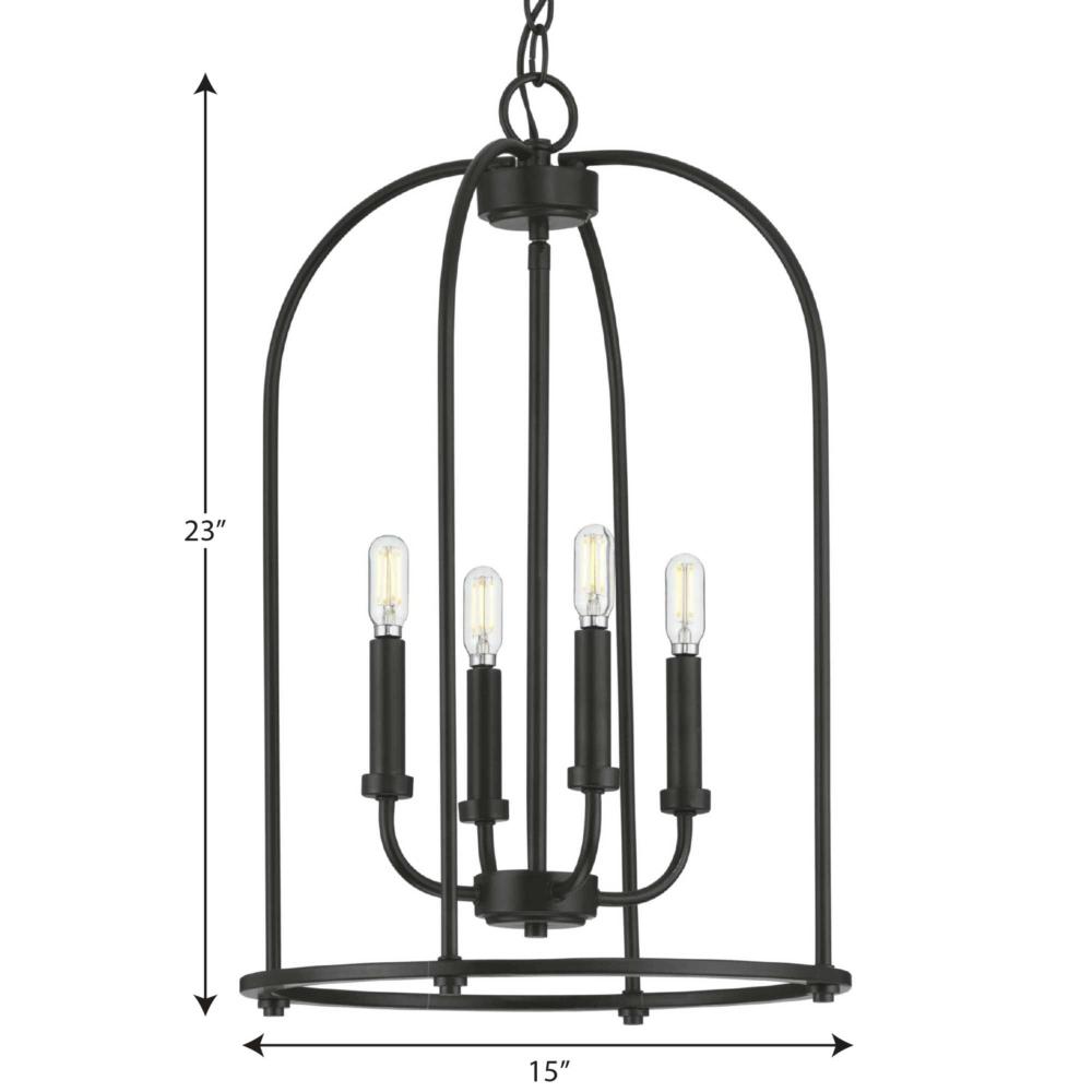 Complement your interiors with the Leyden Collection 4-Light Matte Black Farmhouse Foyer Pendant Light. The gorgeous open-frame and candlestick light bases are coated in a beautiful matte black finish. Light sources glow from atop the smooth light bases for graceful illumination.