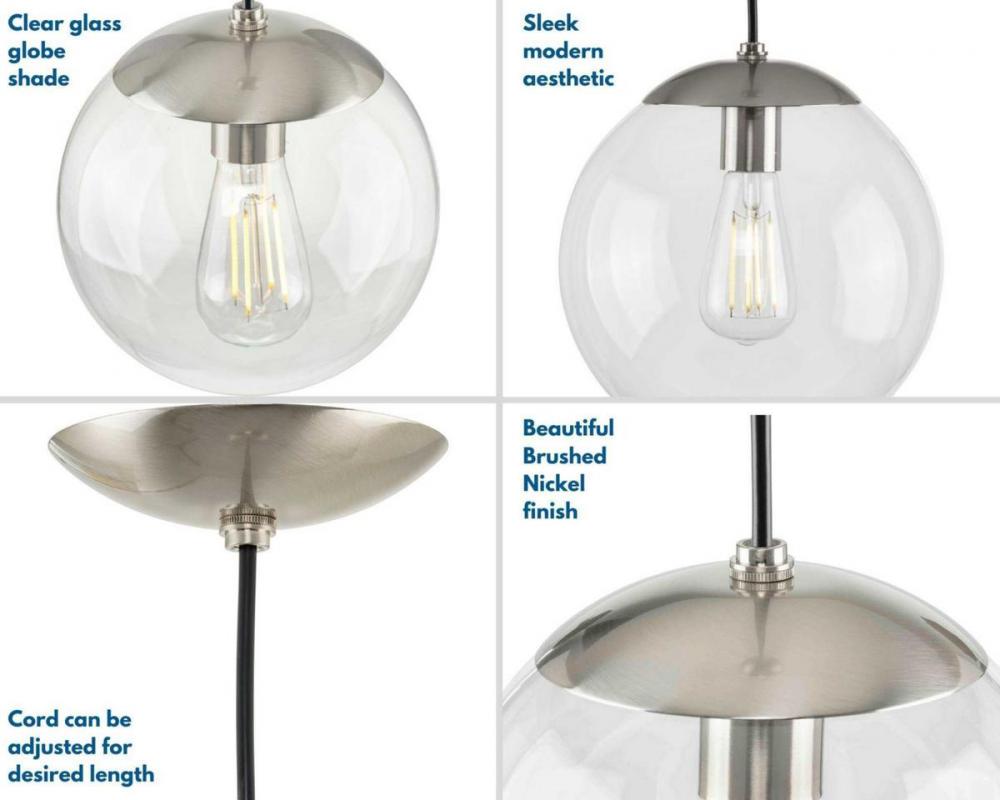 Embrace a statement-making lighting design with the Atwell Collection 1-Light Glass Globe Brushed Nickel Modern Pendant Light. A light source glows from within a clear glass globe shade that fosters a soft and ending design. The metal cap and light base are coated in a beautiful brushed nickel finish that accentuates the hanging light's modern aesthetic.